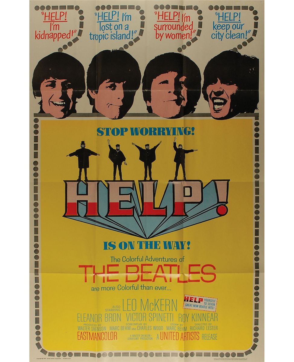 Original color one sheet 26.5 x 40 movie poster for Help!, featuring individual images of the band as well as the classic Help pose. In fine condition, with intersecting storage folds, some mild edge toning, and a single tack hole to each corner tip.