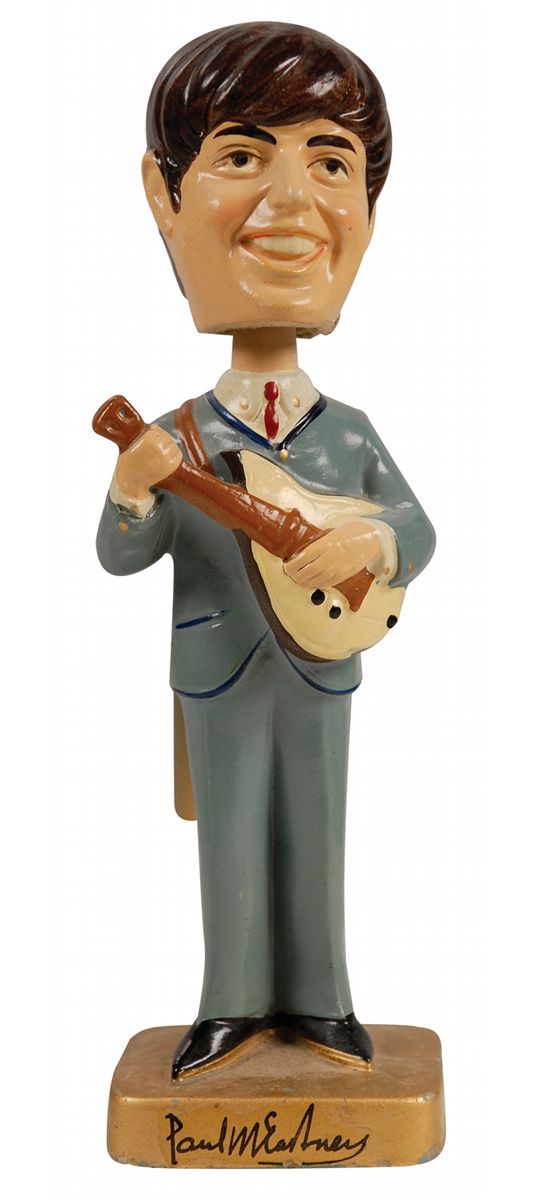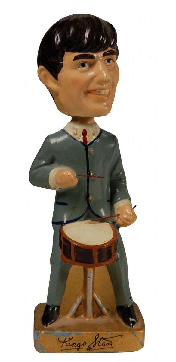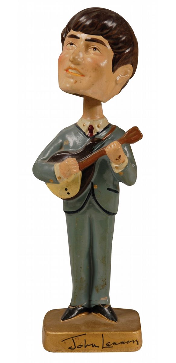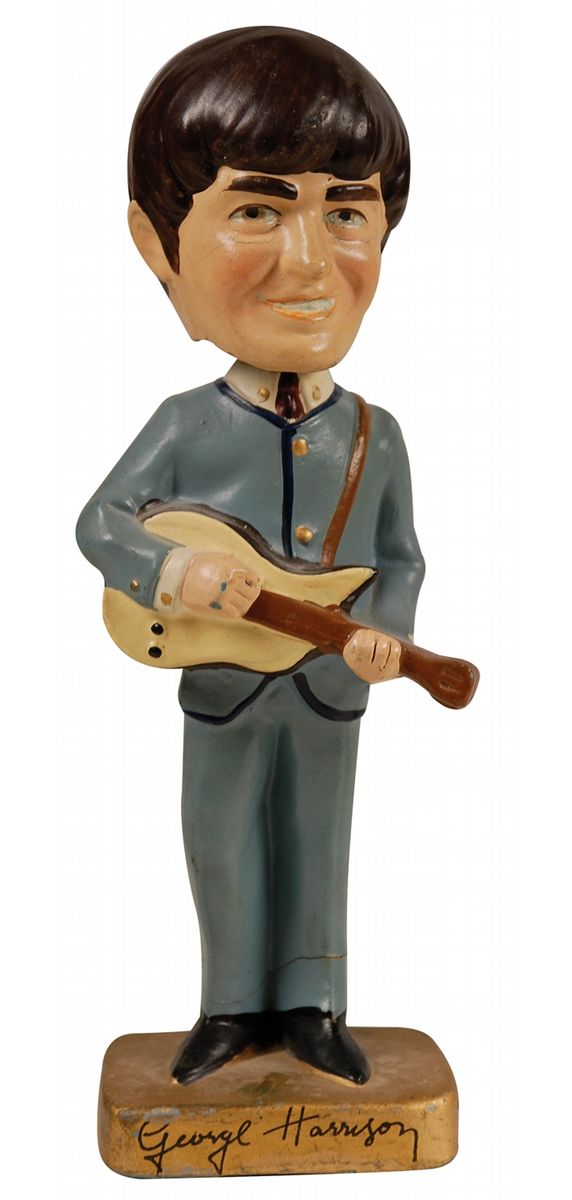 Complete set of four original Beatles ‘Bobbin’ Head Dolls.’ Produced by Carmascots in 1964. Each measuring approximately 3 x 7.5, with Ringo Starr a bit smaller in status, measuring 2.5 x 7. In very good condition, with mild to moderate wear, including scattered rubbing, surface dings, small areas of chipping, and some mild cracking. John exhibits flaking to the base with repaired base extending to trouser hem, Paul exhibits chipping to his neck, George exhibits repairs and and cracks near trouser hem, and Ringo exhibits flaking and a repaired base crack. The original owner may have taken the manufacturer’s advice to achieve maximum motion of the ‘bobbin’ heads by placing them “on the rear window platform of autos—or on top of phonograph players—or close to fan, air conditioning or heating ducts”…a certain recipe for disaster.