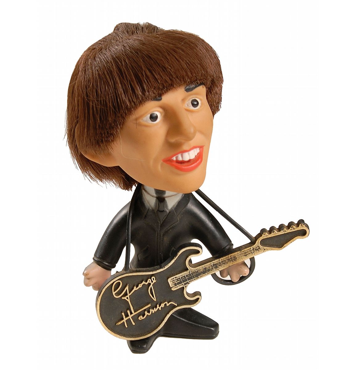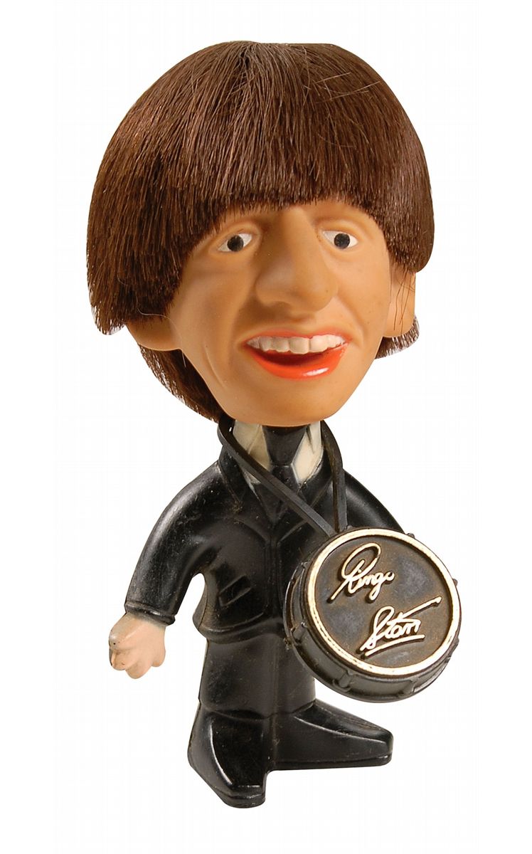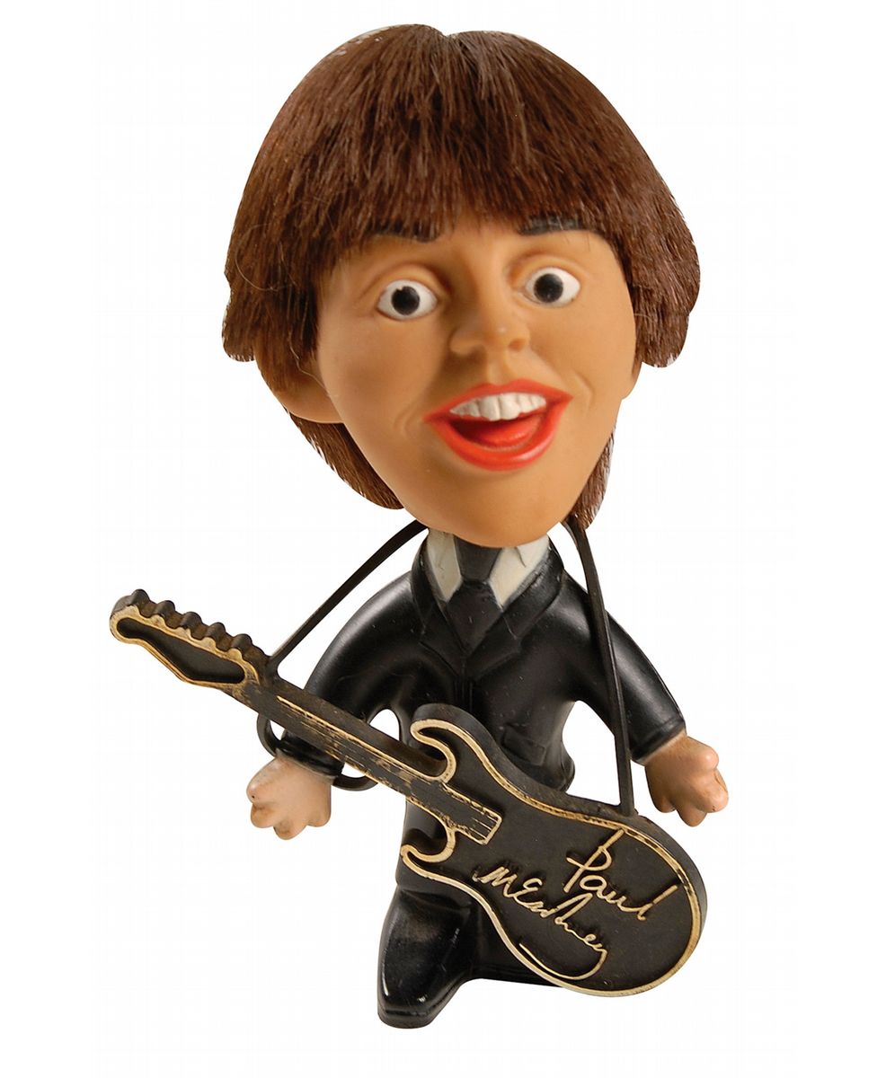 Three Remco dolls measuring 5” high, with rooted hair and black suits, including Paul McCartney, George Harrison, and Ringo Starr, with instruments. One of the most popular of all licensed Beatles items produced in 1964, the Remco dolls were produced with soft and hard bodies. These examples are of the hard body style. In fine condition.