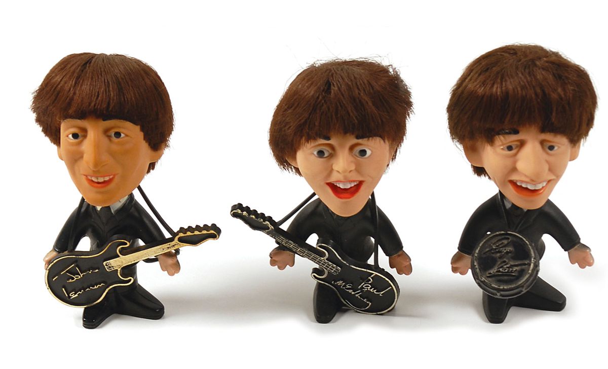 Three original five-inch tall Remco dolls with rooted hair, each holding an instrument bearing his embossed facsimile signature. Included are a John Lennon hard body variation, and soft body versions of Paul McCartney and Ringo Starr. Some wear to gold paint on instruments, otherwise fine condition.