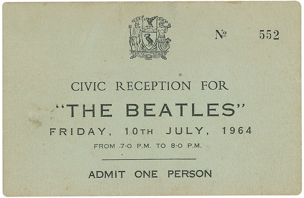 Original ticket from the Civic Reception for The Beatles at Liverpool Town Hall on July 10, 1964, 5.25 x 3.25. The reception was held to commemorate the Northern Premiere of their first feature film A Hard Day's Night. In very good condition, with a few creases and surface impressions and some scattered light toning and soiling. On this occasion nearly a quarter of a million people lined the streets of Liverpool, from the airport to the Town Hall. The Beatles made a sensational appearance on the balcony to a tumultuous welcome by the assembled fans. Accompanied by a certificate of authenticity from Tracks.