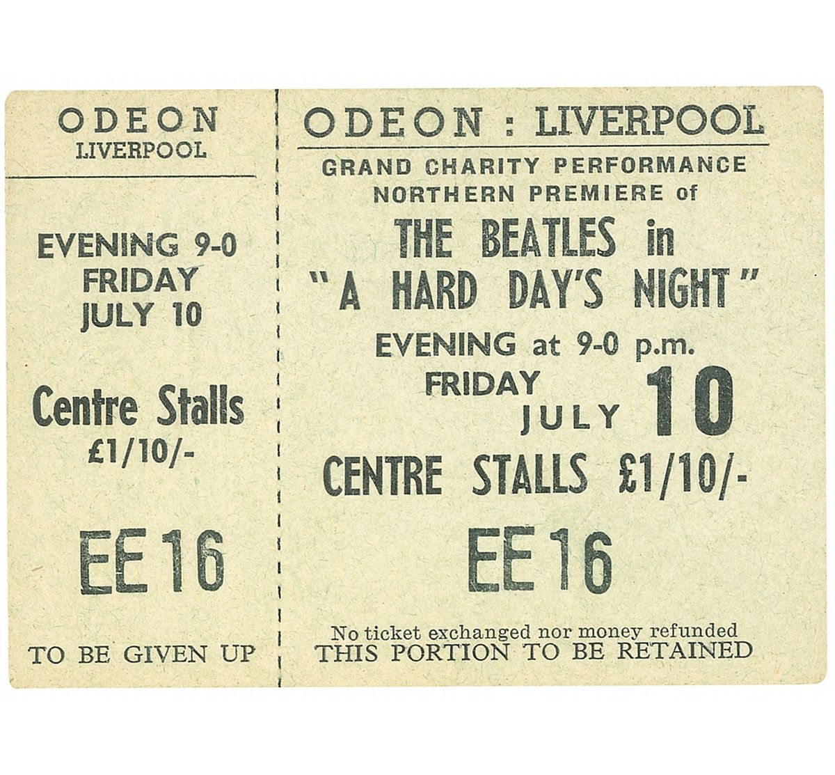 Original unused green center stalls ticket, 4 x 3, from the Grand Charity Performance Northern Premiere of the Beatles film A Hard Day's Night at the Liverpool Odeon on July 10, 1964. A partial separation along perforation and some mild toning, otherwise fine condition. Accompanied by a certificate of authenticity from Tracks.