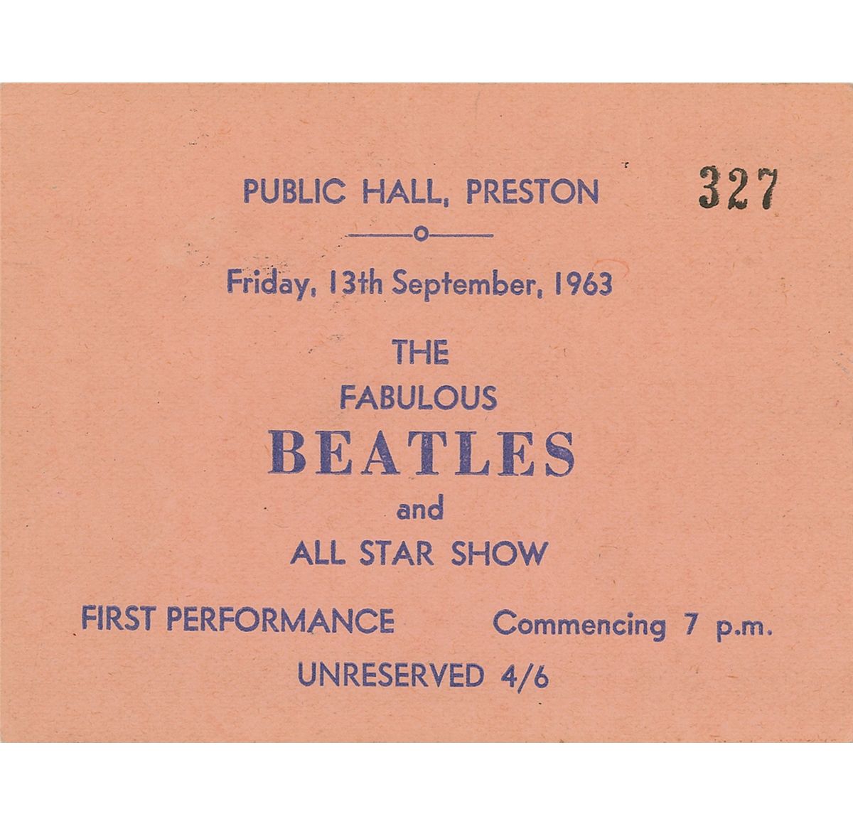 Original unused ticket, 4.5 x 3.5, from the first performance of “The Fabulous Beatles and All Star Show,” 7 pm performance at Public Hall, Preston, on September 13, 1963. In fine condition. Accompanied by a certificate of authenticity from Tracks.