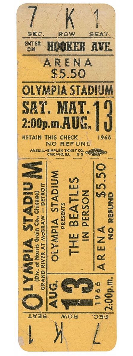 Original unused ticket from the Beatles matinee show at the Olympia Stadium, Detroit, on 13th August 1966, 5 x 1.5. In good condition, with moderate creasing, several edge tears, and fading to right side of ticket. Accompanied by a certificate of authenticity from Tracks.