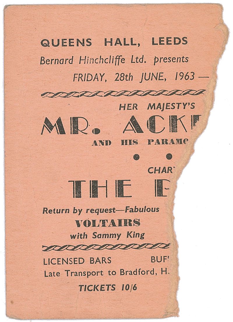 Left hand side of a concert ticket from the Beatles only performance at the Queens Hall in Leeds, held on June 28, 1963. The band played in front of 3200 people, and were supported by Acker Bilk and his Paramount Jazz Band. In very good condition, with scattered creases, uneven right edge, and a bit of light toning. Accompanied by a certificate of authenticity from Tracks.