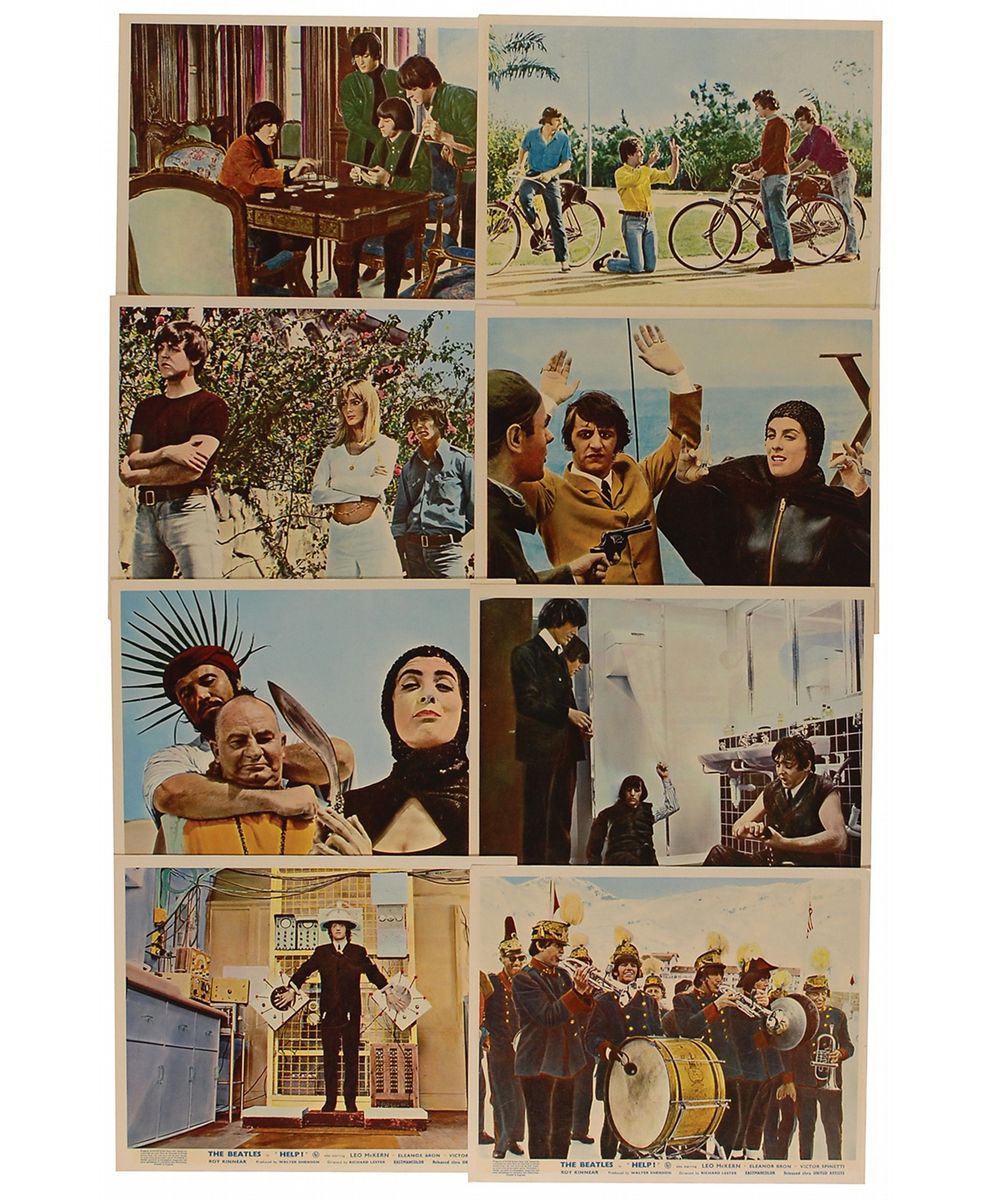 A set of eight color 10 x 8 promotional lobby cards from the 1965 release of The Beatles film 'Help!'. The cards feature various color images and production details of the film. Scattered creases and edge wear, otherwise fine condition. Accompanied by a certificate of authenticity from Tracks.
