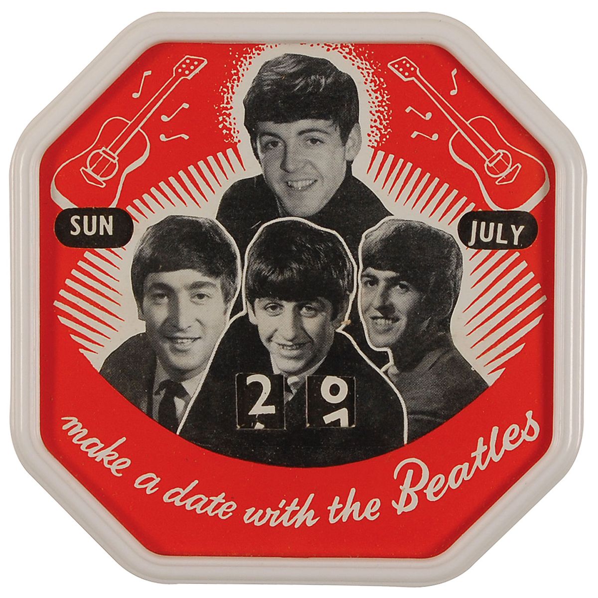 Original Beatles ‘Make a Date’ calendar circa 1964. The eight-sided red, black, and white calendar measures 5 x 5, and is in magnificent condition. In very fine condition. Accompanied by a certificate of authenticity from Tracks.
