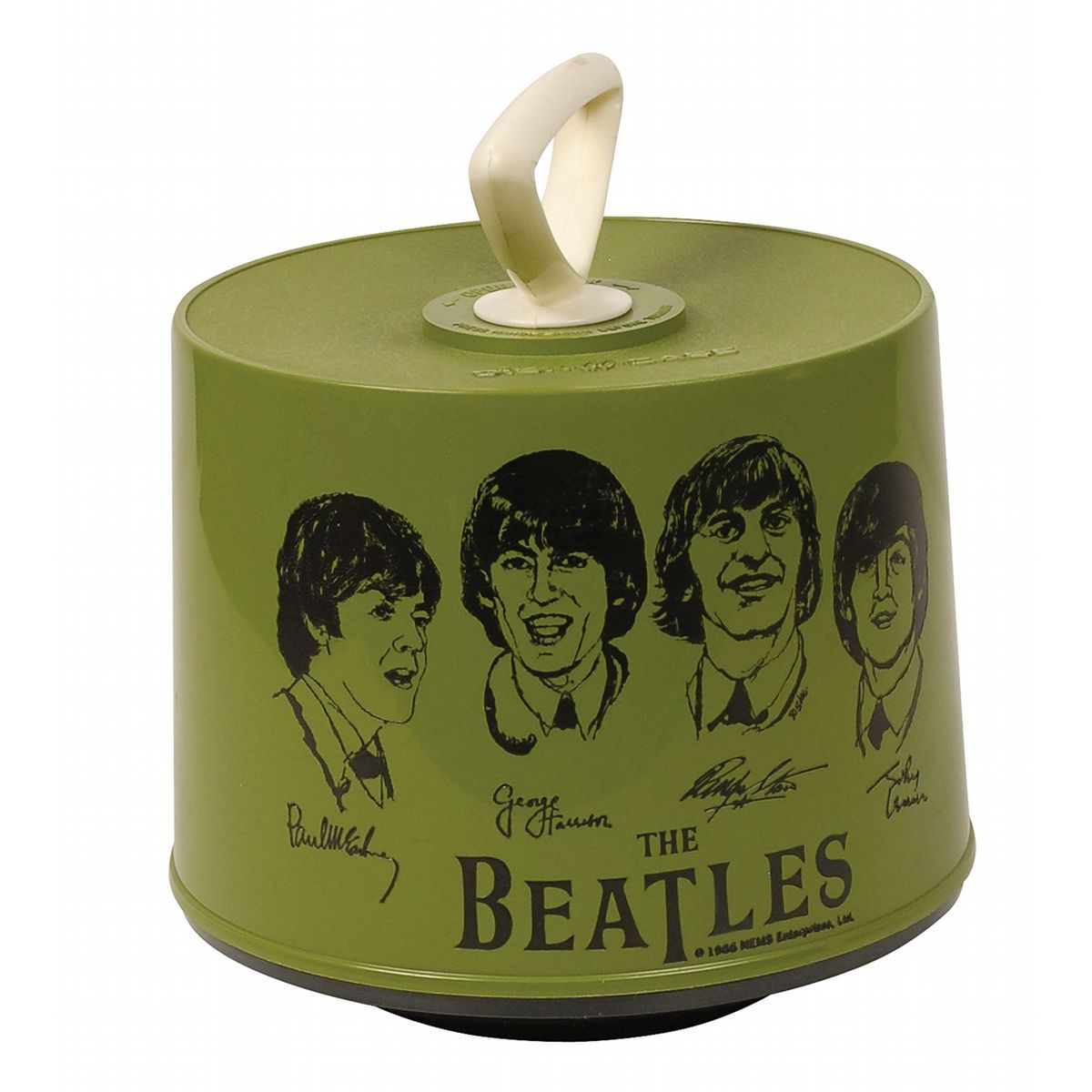 Original 1966 green ‘Disk-Go-Case,’ approximately 9 inches tall and 8 inches in diameter, bearing an image and facsimile signature of each Beatle on the side. Base is marked: “Product of Charter Industries.” The case was designed to hold 60 45 rpm records and was issued in eight colors, green being a rarer variant. In fine condition, with a few light surface marks and scratches.