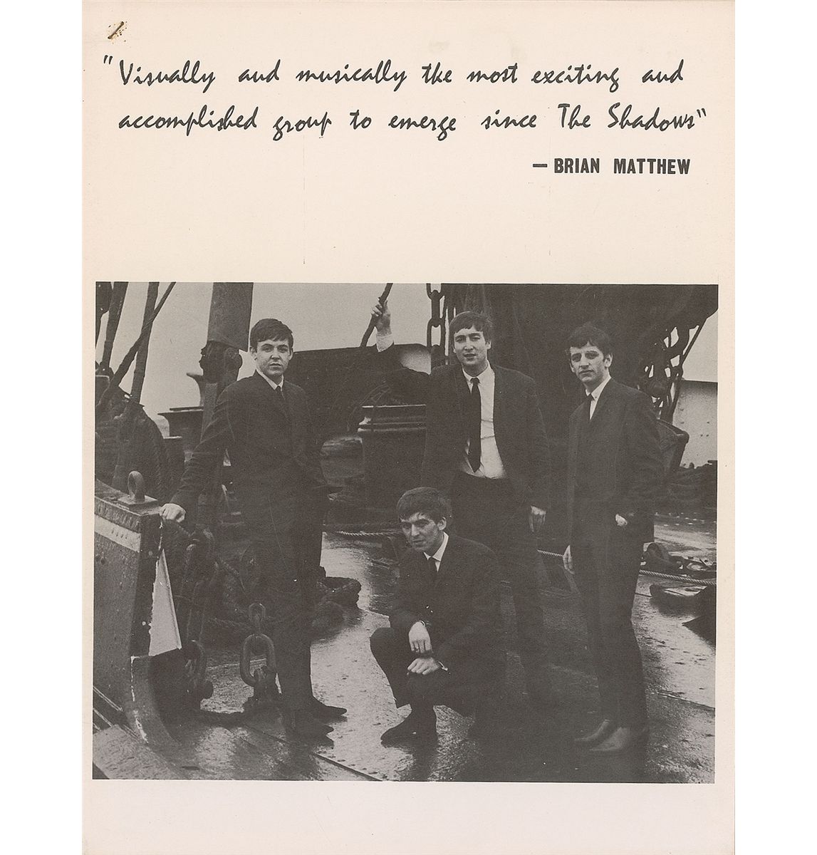 Original press kit from the 1963 release of The Beatles single 'From Me to You,' seven pages, 8.5 x 11. Front cover is a large picture of the band with a quote from Brian Matthew, which states “Visually and musically the most exciting and accomplished group to emerge since the Shadows.” Contents consist of a newspaper cuttings collage, a special pre-release quote from Brian Matthew, a Parlophone review of the single, a schedule of upcoming appearances, and details of the Please Please Me album release. In fine condition, with a staple to top left corner. Accompanied by a certificate of authenticity from Tracks.