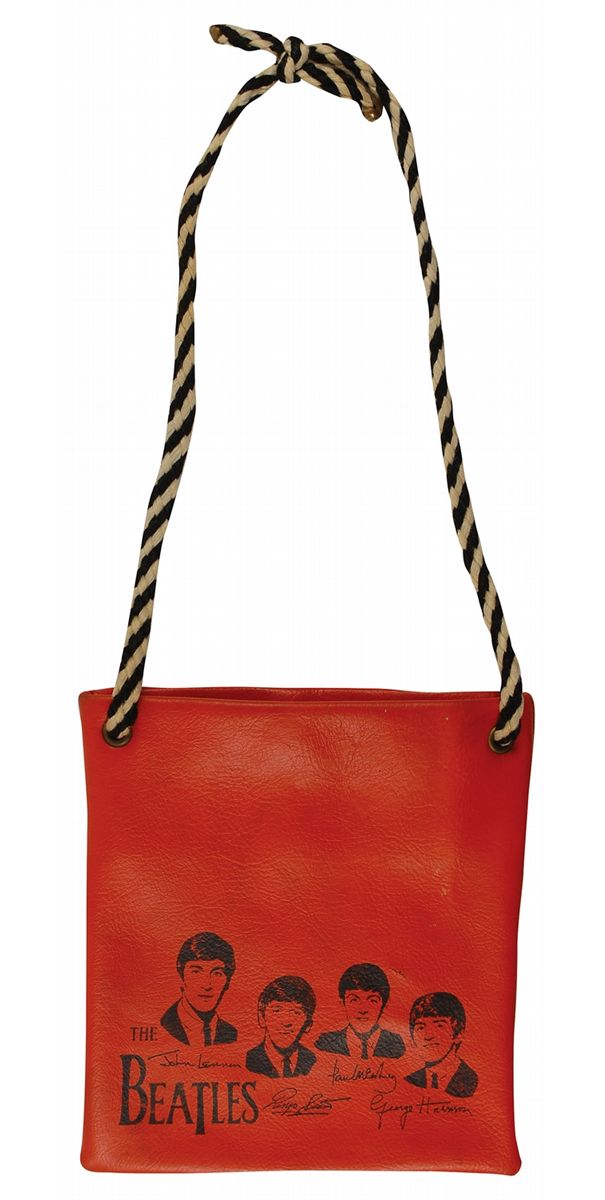 Vinyl 9.5 x 10 Beatles shoulder bag. Red bag has a braided rope handle with images of the band on the front, as well as their facsimile signatures. Some scattered light wear and a couple small surface tears, otherwise fine condition.