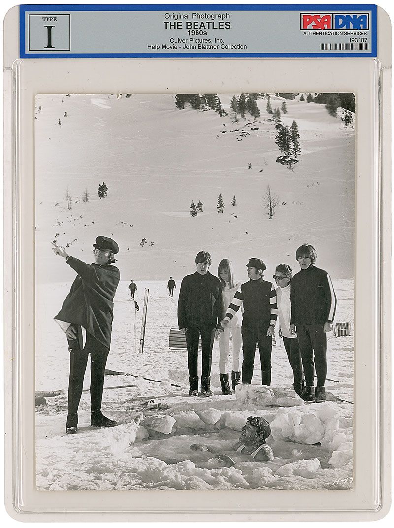 Original glossy 7.25 x 9 first generation Culver Pictures photo of The Beatles from Help!, showing the band at a ski resort standing around a man submerged in ice water. Encapsulated in a plastic PSA/DNA identification holder. In fine condition, with some scattered light creases and surface marks, a couple small tears to top edge, and stamps and notations on reverse.