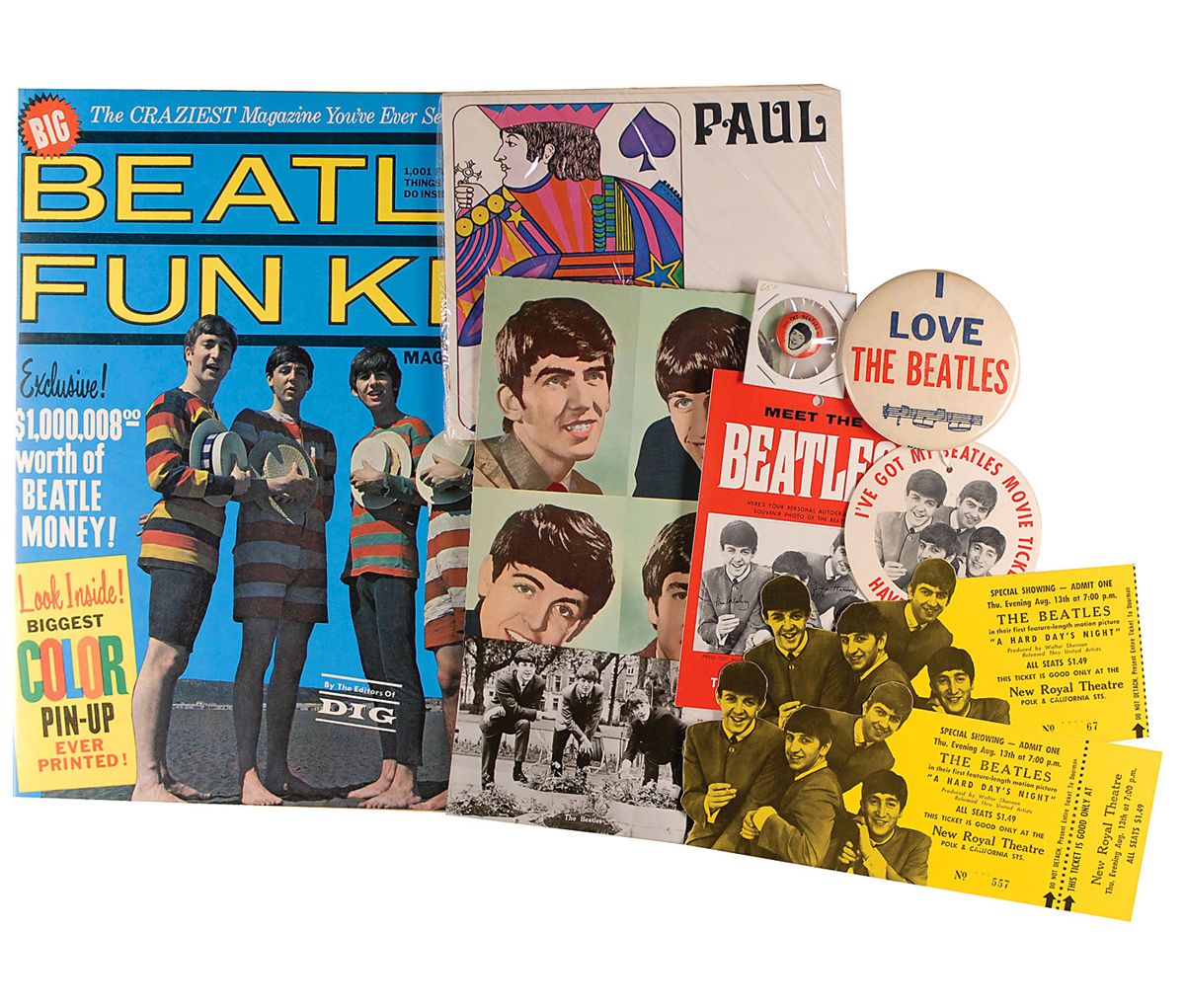 Eleven pieces of original 1960s ephemera and memorabilia: ticket to an advanced preview showing of Help! at the Colony Theatre, August 23 in White Plains, NY, 8.5 x 3.5, double-matted with a color photo to an overall size of 14 x 18; Beatles Fun Kit, 10.5 x 13.75, 50 pages; two vintage postcards, 5.5 x 3.5 and 5.75 x 8, one color; Beatles Birth Certificate booklet, still sealed, 7.75 x 6.75, encased in the original wrapper; circular 3.75 x 3.75 ‘A Hard Day’s Night’ wrist band (missing string) embossed with photo and ‘I’ve Got My Beatles Movie Ticket—Do You?’; ticket stub to a special showing of A Hard Day’s Night on August 13 at the New Royal Theatre, 9 x 4 and 7.5 x 4; ‘Meet the Beatles’ shirt tag, 4 x 6.5; and two pins, a 1 x 1 featuring McCartney’s face, and a 3.5 x 3.5, featuring ‘I Love The Beatles’ with a music bar underneath. In fine condition, with expected wear to the larger pin.