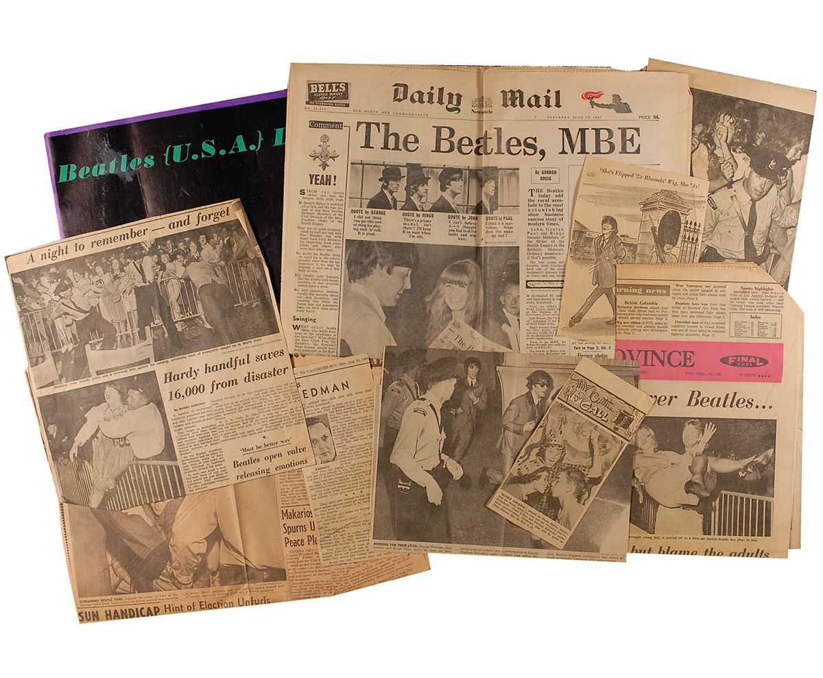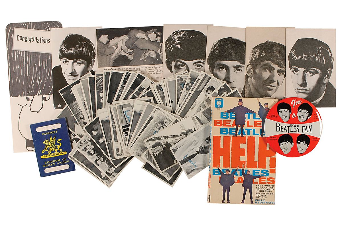 Sixty items: stack of 49 Beatles trading cards, second and third series, 2.5 x 3.5 and 3.5 x 2.5, each bearing a facsimile signature from the Beatle pictured; Passport for the Kingdom of Whisky A’GoGo, 2.5 x 3.75; original Beatles (U. S. A.) Ltd., program 12 x 12; Beatles birthday card, 4 x 9; four matte-finish 3.5 x 5.5 promotional head-shots of each Beatle; glossy postcard, 3.5 x 5.5, featuring Ringo Starr; Beatles Help! softcover book, 4.5 x 7; Official Beatles Fan oversized pin, 4 inches in diameter; and various vintage newspaper clippings, featuring stories about the Beatles. In very good condition, with expected wear to the trading cards, scattered creasing and wear to the program, light rubbing and a few trivial creases to the book, and uniform toning, creasing, and some tears to the newspaper clippings.