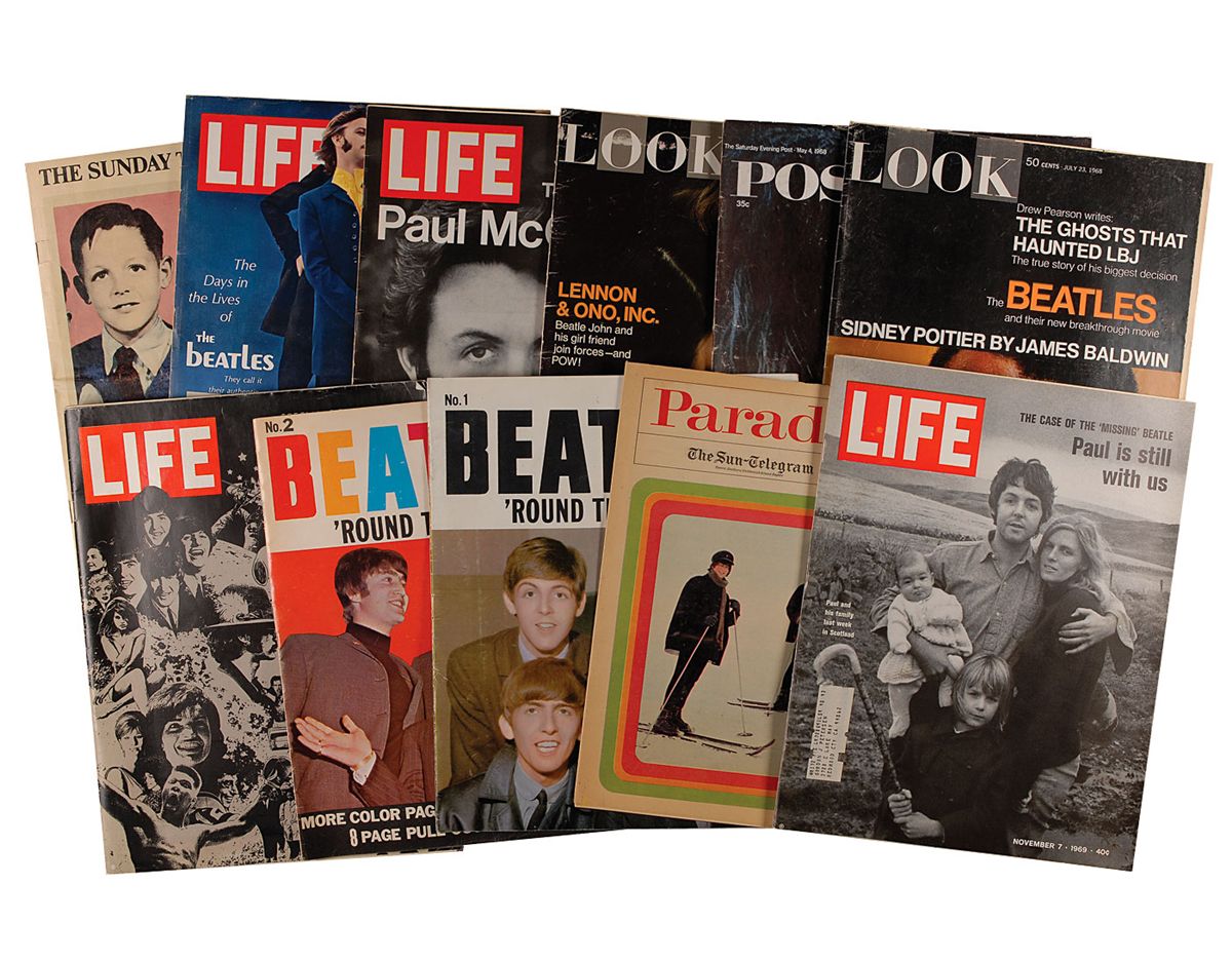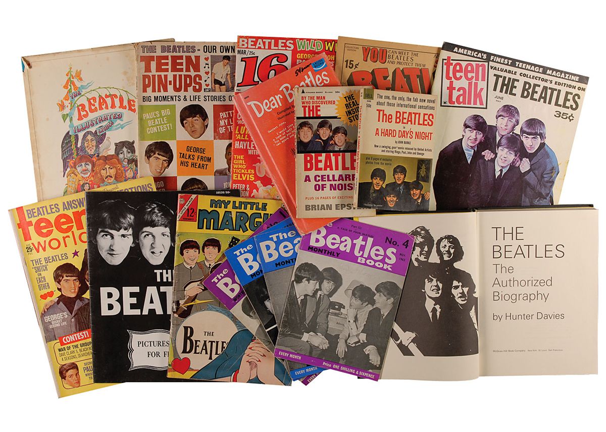 Thirty-five items: 30 vintage 1960s magazines, ranging in size from 6 x 8.5 to 10.5 x13.5, including four issues of The Beatles Monthly Book from 1963/64, Beatles’ Round The World, Teen Talk, eight issues of Life, three issues of Look, and others; and four books: A Cellarful of Noise, A Hard Day’s Night, Dear Beatles, and The Beatles Illustrated Lyrics; and one vintage comic book, My Little Margie, 7 x 10.25. Light wear to the magazines, and moderate wear, foxing and a few tears to the dustjacket of the Illustrated Lyrics book, otherwise fine condition.