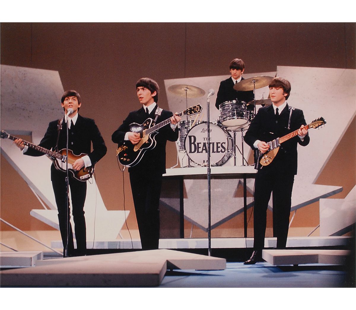 Color glossy 16 x 12 photo of the Beatles taken from the original negatives of the band performing on the Ed Sullivan Show on February 9, 1964. In fine condition. Accompanied by a certificate of authenticity from Tracks.