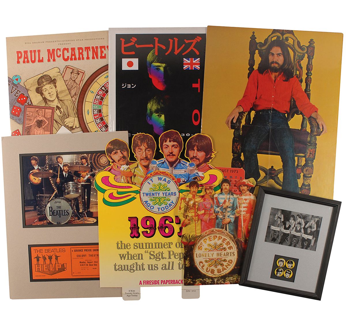 Seven Beatles posters and displays, ranging in size from 8.5 x 11.5 to 15 x 21: a set of four 1964 pins, each bearing a caricature of one Beatle, matted and framed with a photo of the group; one ticket to an advance prevue showing of Help!, double-matted with a photo of the Beatles performing; one August 1973 calendar poster featuring George Harrison on a throne, removed from Circus Magazine; one die-cut Sgt. Pepper’s standee featuring all four Beatles behind the famous bass drum; one die-cut Sgt. Pepper’s-styled display featuring images of all four Beatles; one limited-edition Japanese poster of all four Beatles, numbered #7130/25000, published in 1995; one poster for a Paul McCartney concert in Las Vegas, presented by Bill Graham. In overall fine condition, with bisecting folds to the Harrison poster.