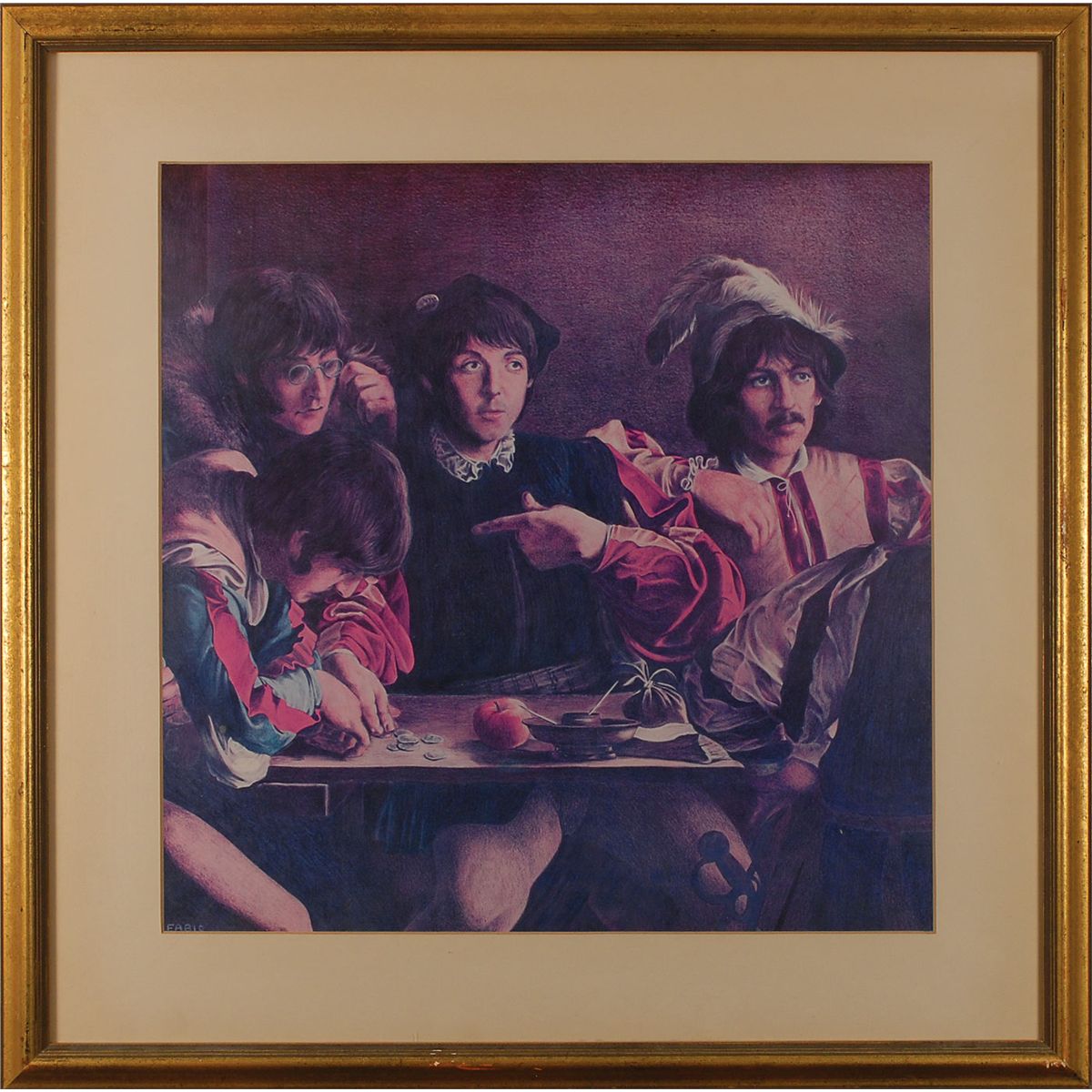 Unusual color 19.5 x 19.75 print of the Beatles as medieval subjects, nicely matted and framed to an overall size of 28 x 28. In fine condition.