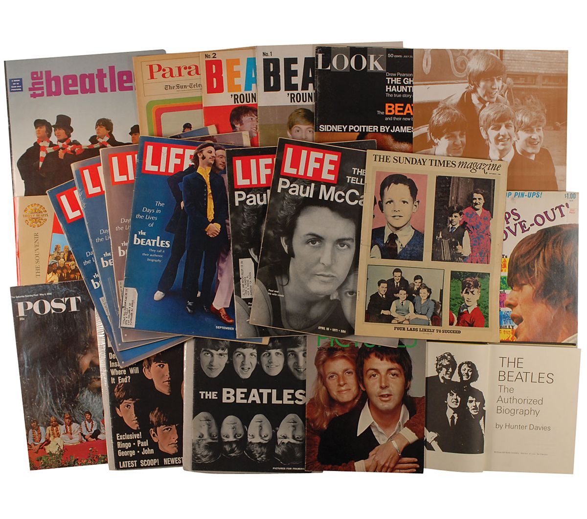Approximately 24 publications, including: a 1968 hardcover first edition of The Beatles: The Authorized Biography by Hunter Davies; four copies of the September, 13, 1968, edition of Life magazine featuring a group portrait on the front cover; four other editions of Life magazine; a 1968 Post magazine describing the Beatles’ visit to the Maharishi; a Beatles ’Round the World magazine; a few different Beatles photo books; and various editions of Parade, Look, Rolling Stone, and others. In overall fine condition, with various toning and creases to some of the magazines.