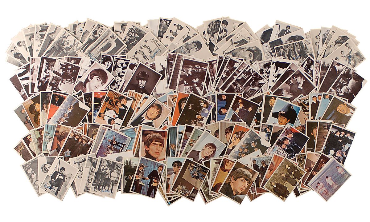 Approximately 400 Beatles trading cards from various sets. Included are a complete 60 card set of the first series of Beatles cards (each with a tack hole to top edge); a complete 55 card set of the A Hard Day’s Night series; 52 of 60 cards from the Beatles Diary set; and 53 of 64 cards from another set. Also included are about 150 duplicates. In very good to fine overall condition, with tack holes to edges of some of the cards. A huge selection of cards!