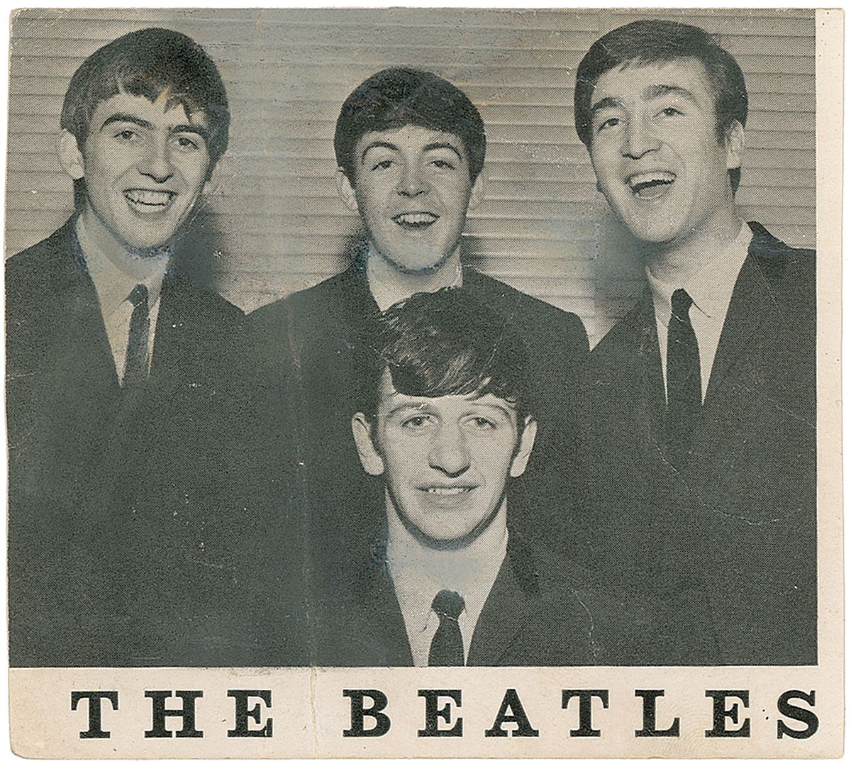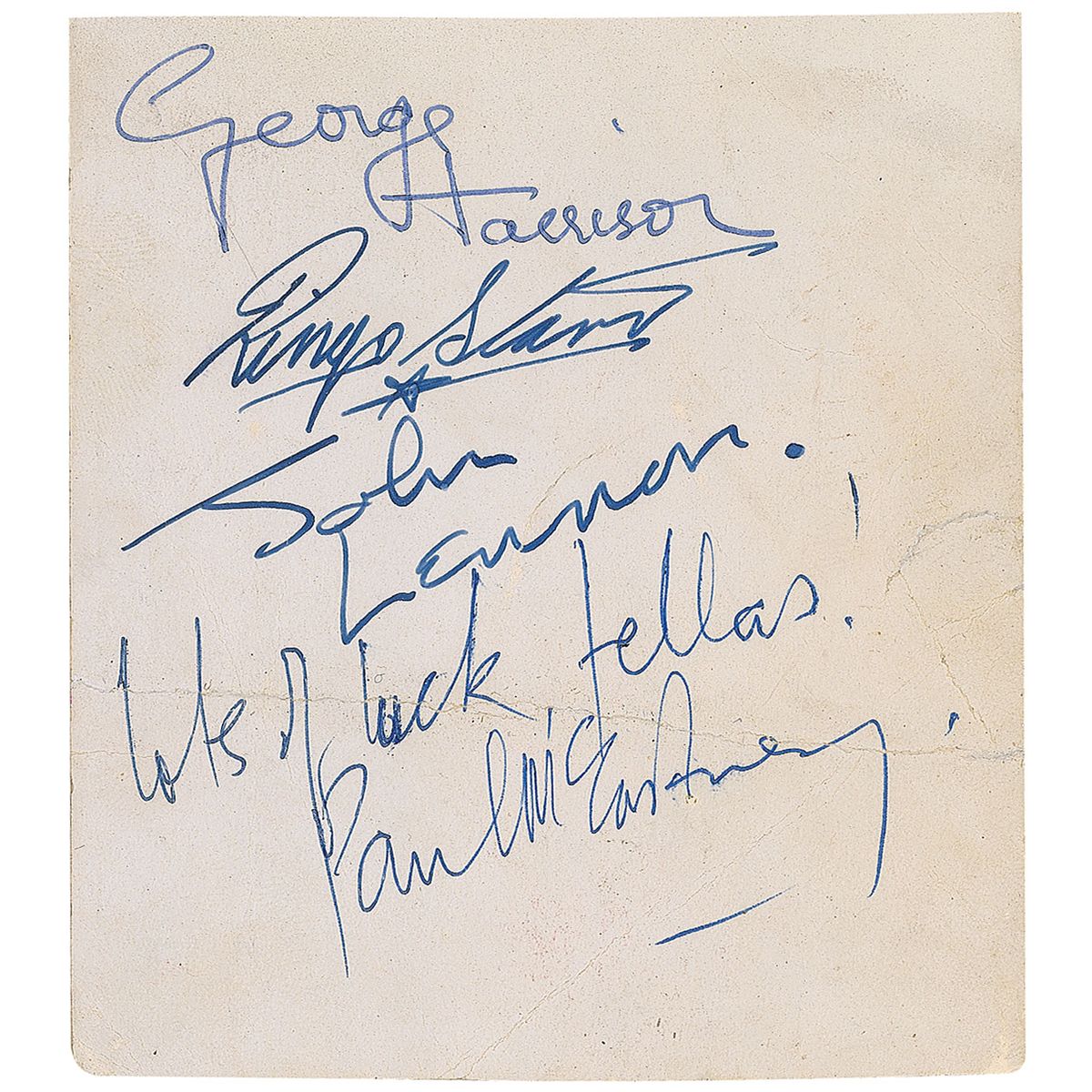 Vintage Beatles 1963 Parlophone postcard photo, trimmed to a size of 3.5 x 4, boldly signed on the reverse in ballpoint, “George Harrison,” and “Lots of luck fellas! Paul McCartney,” and signed in fountain pen “Ringo Starr,” and “John Lennon.” In very good condition, with photo having been professionally cleaned and restored, aforementioned trimmed edges, noticeable crease through McCartney’s signature and sentiment, and remnants of small ink notations and tape removed from image side. Accompanied by two letters of authenticity from noted Beatles experts Frank Caiazzo and Perry Cox. Caiazzo notes that this was signed “within a couple months of its issuance.” Parlophone Records produced a small quantity of promotional photocards in two formats—a horizontal and a vertical, both with pictures being shot by Dezo Hoffman while the Beatles were in the studio. Almost all of these cards were signed on the reverse, because there was very little light area on the front of the cards for their signatures.