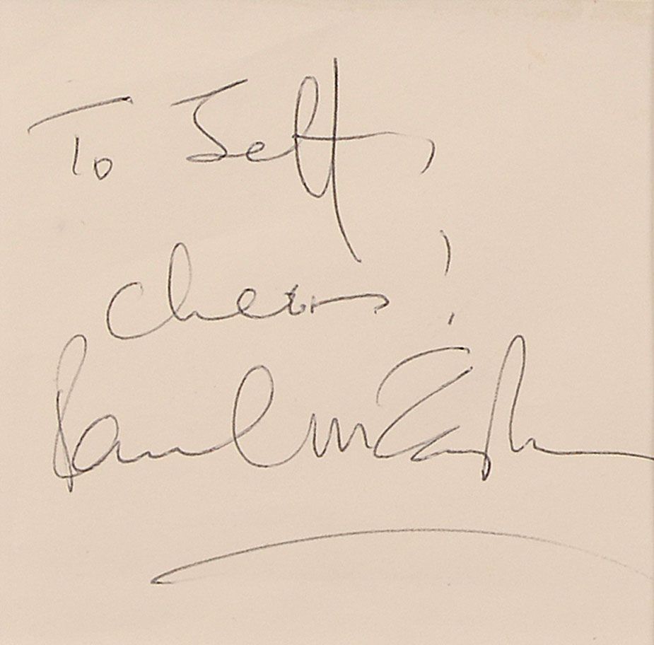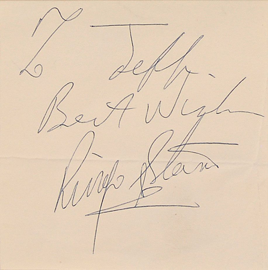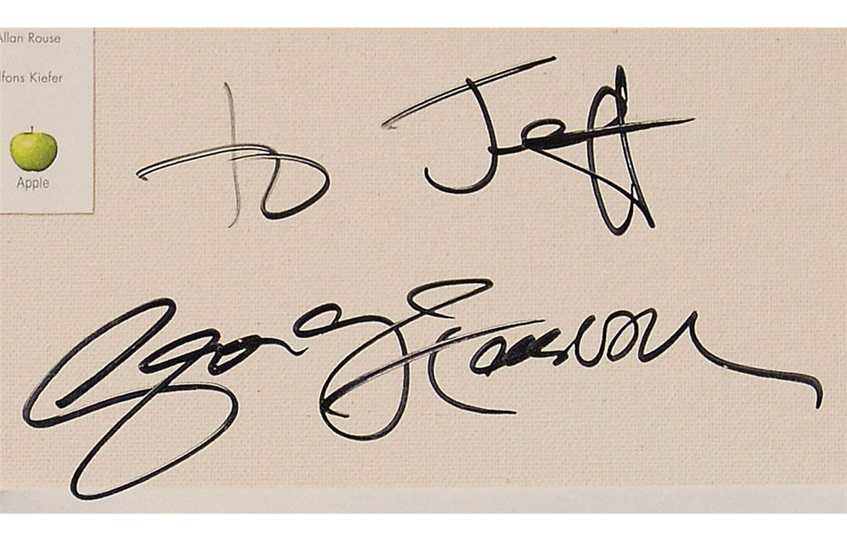 Ballpoint signature and inscription, “To Jeff, Cheers! Paul McCartney,” and “To Jeff, Best wishes, Ringo Starr,” on individual off-white slips; and a promotional copy of the Beatles Anthology album, signed and inscribed on the back cover in black felt tip, “To Jeff, George Harrison.” All three are double-matted together with three original color candid snapshots of Ringo and a printed John Lennon memoriam to an overall size of 30.5 x 28. A horizontal fold passing through Ringo’s signature, a few creases to both slips, and promotional label affixed to album cover, otherwise fine condition. Oversized. The signatures and candid photos were personally obtained by D. J. Fontana for his son Jeff.