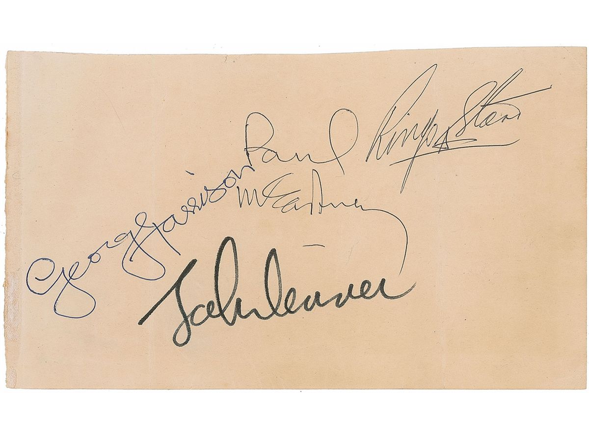 Vintage ballpoint signatures dating from 1967, “George Harrison,” “Paul McCartney,” and “Ringo Starr” and a felt tip signature, “John Lennon,” on an off-white 8.5 x 5 sheet. All four signatures, originally obtained in September 1967 on the set of the Magical Mystery Tour in Newquay, England, remain notably large and bold. In fine condition, with two vertical folds, passing through single letters of Starr’s and Harrison’s signatures, and a small crease above Lennon’s signature. Accompanied by an oversized color 13.75 x 9.5 postcard of the Beatles in their Sgt. Pepper uniforms. Signatures of the band from this time period are quite scarce, as the band had stopped touring the year before.