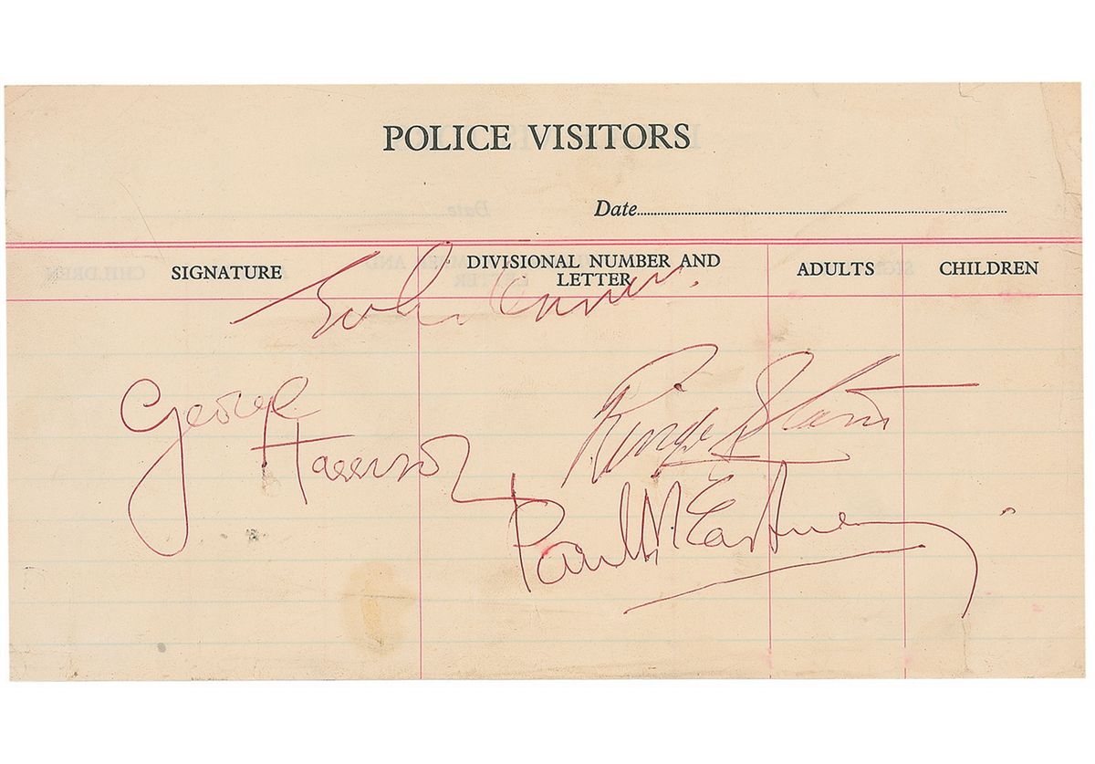Vintage circa 1963 red ballpoint signatures, “John Lennon,” “Paul McCartney,” “George Harrison,” and “Ringo Starr,” on an off-white 8.25 x 4.5 sheet of lightly-lined police visitors log paper. Scattered creases and a light circular stain to the lower left (not affecting any signatures), and the ink a bit light in several letters, otherwise fine condition. Accompanied by a certificate of authenticity from Tracks. Also includes a typed statement from the original recipient, stating that he was a zookeeper at the London Zoo and acquired the signatures while the Beatles were secretly visiting a restaurant there, as he recalls, for the presentation of a gold record for ‘She Loves You.’ Upon meeting the band, he had them sign the only paper available—using a pen borrowed from Brian Epstein! A remarkable set of signatures from the early days of the Beatles’s stardom.