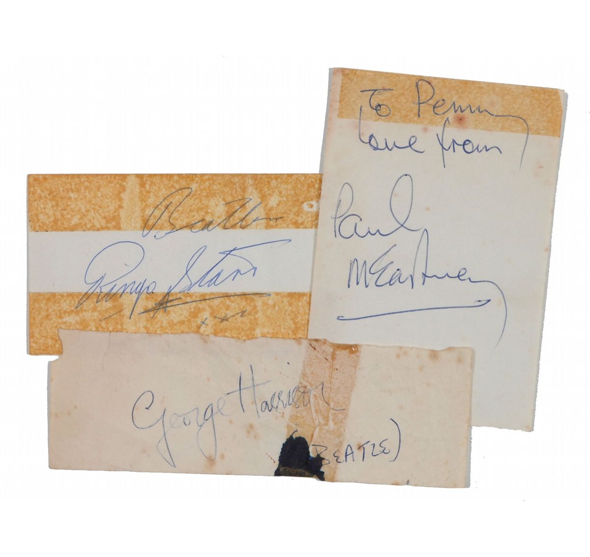 Vintage ballpoint signatures and inscription, “To Penny, Love from Paul McCartney,” “George Harrison (Beatle),” and “Beatles, Ringo Starr,” on individual off-white slips. In good condition, with an old tape repair to a complete vertical separation to Harrison’s slip, affecting last few letters of signature, moderate tape toning to McCartney’s inscription and portion of Ringo’s signature, and creasing to Harrison’s slip. Given the Beatles’ hit ‘Penny Lane,’ McCartney’s inscription is especially endearing.