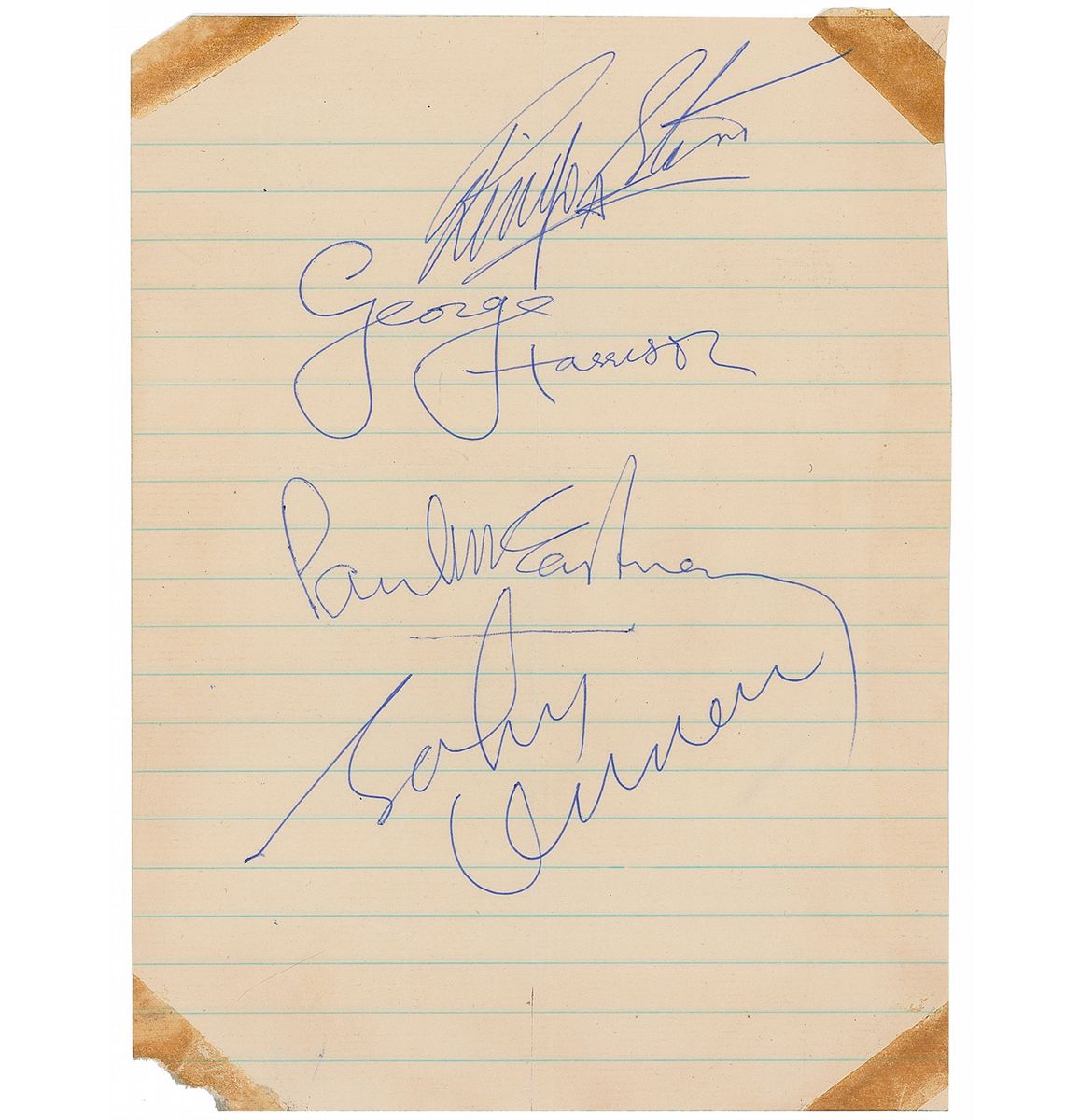 A beautiful set of vintage ballpoint signatures, “Ringo Starr,” “George Harrison,” “Paul McCartney,” and “John Lennon,” on an off-white 6 x 8 lightly-lined sheet. In fine condition, with two light folds, one vertical and one horizontal (vertical fold passes neatly through a single letter of each signature), tips missing from two corners, and old tape remnants to each corner, much of which could easily be matted out. Signatures were obtained at the Scala Theatre in March 1964 during the filming of A Hard Days Night. As good a set as you are likely to find with all signatures evenly spaced and much larger than usually seen.