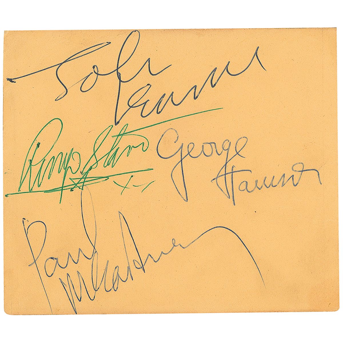 Vintage ballpoint signatures, “John Lennon,” “Paul McCartney,” “George Harrison,” and “Ringo Starr,” on an off-white 4.25 x 3.5 album page. Affixed to a same-size card. In fine condition, with a couple slight creases and wrinkles. Accompanied by a certificate of authenticity from Tracks and a letter of provenance from the original recipient who states that the signatures were obtained backstage in 1963 during the Beatles’s tour with Roy Orbison—most likely on May 18th at the Adelphi Theatre in Slough. An exceptionally nice vintage example featuring all four Beatles.