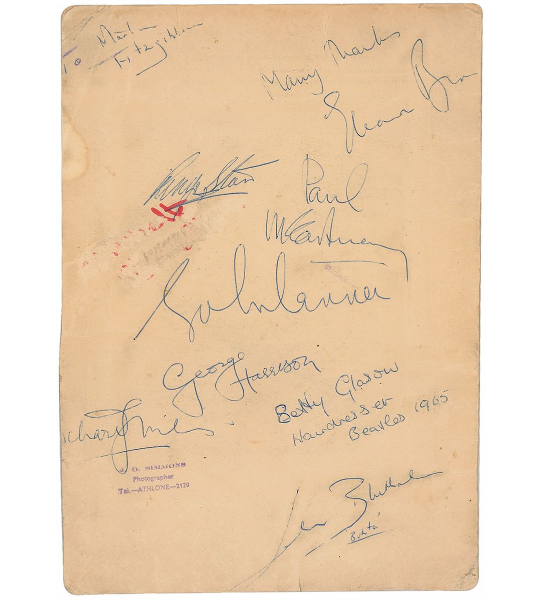 Vintage ballpoint signatures, “John Lennon,” “Paul McCartney,” “George Harrison,” and “Ringo Starr,” on the reverse of an off-white 7 x 9.75 photo mount. Also signed by actors John Bluthal and Eleanor Bron, hairdresser Betty Glasow, and one other, and inscribed “To Martin Fitzgibbon” in the upper left. In very good condition, with scattered creases and soiling, an area of surface loss below Starr’s signature where some writing has been scratched off, and trimmed edges (affecting no Beatles signatures). Accompanied by a certificate of authenticity from Tracks and a letter of provenance from the owner who states that the signatures were obtained by Fitzhugh while he was working at the Antrobus Arms Hotel in Amesbury, Wiltshire, where the Beatles stayed while filming Help! in 1965.