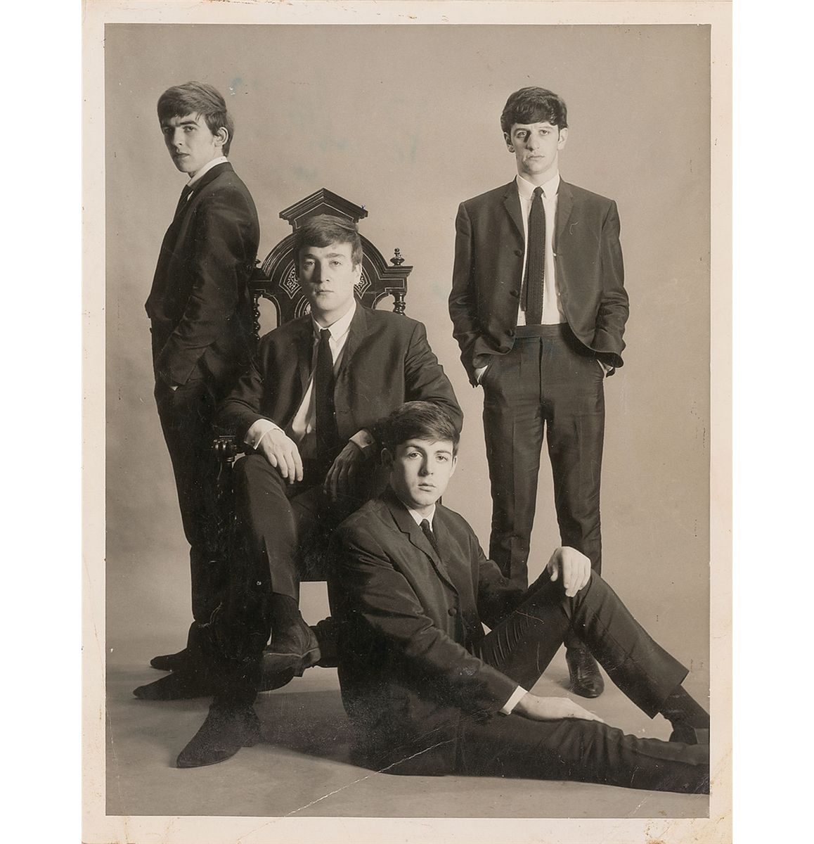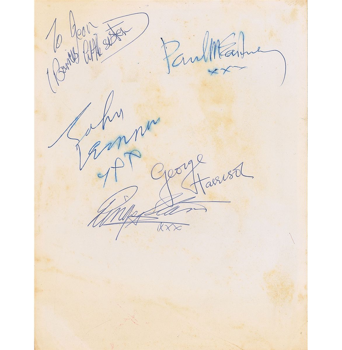 Vintage original glossy 6.5 x 8.5 photo of the Beatles taken by Astrid Kircherr in November of 1962, showing the band dressed in matching suits, with John Lennon seated in a chair and Paul McCartney seated on the floor, signed on the reverse in blue ballpoint, “Paul McCartney xxx,” “John Lennon xxx,” “George Harrison,“ and “Ringo Starr xxx.” Reverse also bears a ballpoint inscription in an unknown hand. In very good condition, with some light spreading of ink to portions of Lennon’s and McCartney’s signatures, scattered light toning to the signed side, and some noticeable creases to image side. Accompanied by two letters of authenticity from noted Beatles expert Frank Caiazzo, one dating the signatures to the summer of 1963, “when the Beatles performed at the Queen’s Theatre in Blackpool, England, signed for a gentleman who helped them take their equipment into the venue.” Also included is a letter from Beatles expert Perry Cox, dating the signatures to either July 21 or August 4, 1963. A crystal-clear larger size portrait than usually found during this time period, taken by a close friend of the band, and boasting large signatures from the beginning of Beatlemania.