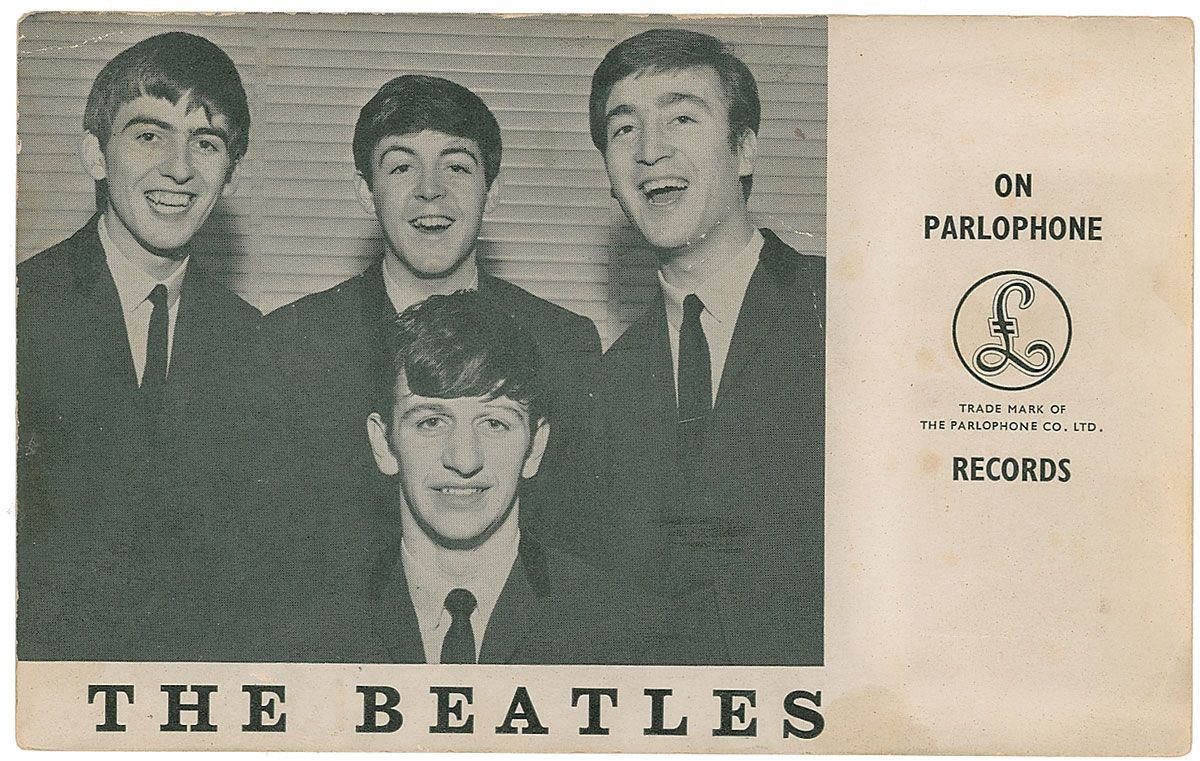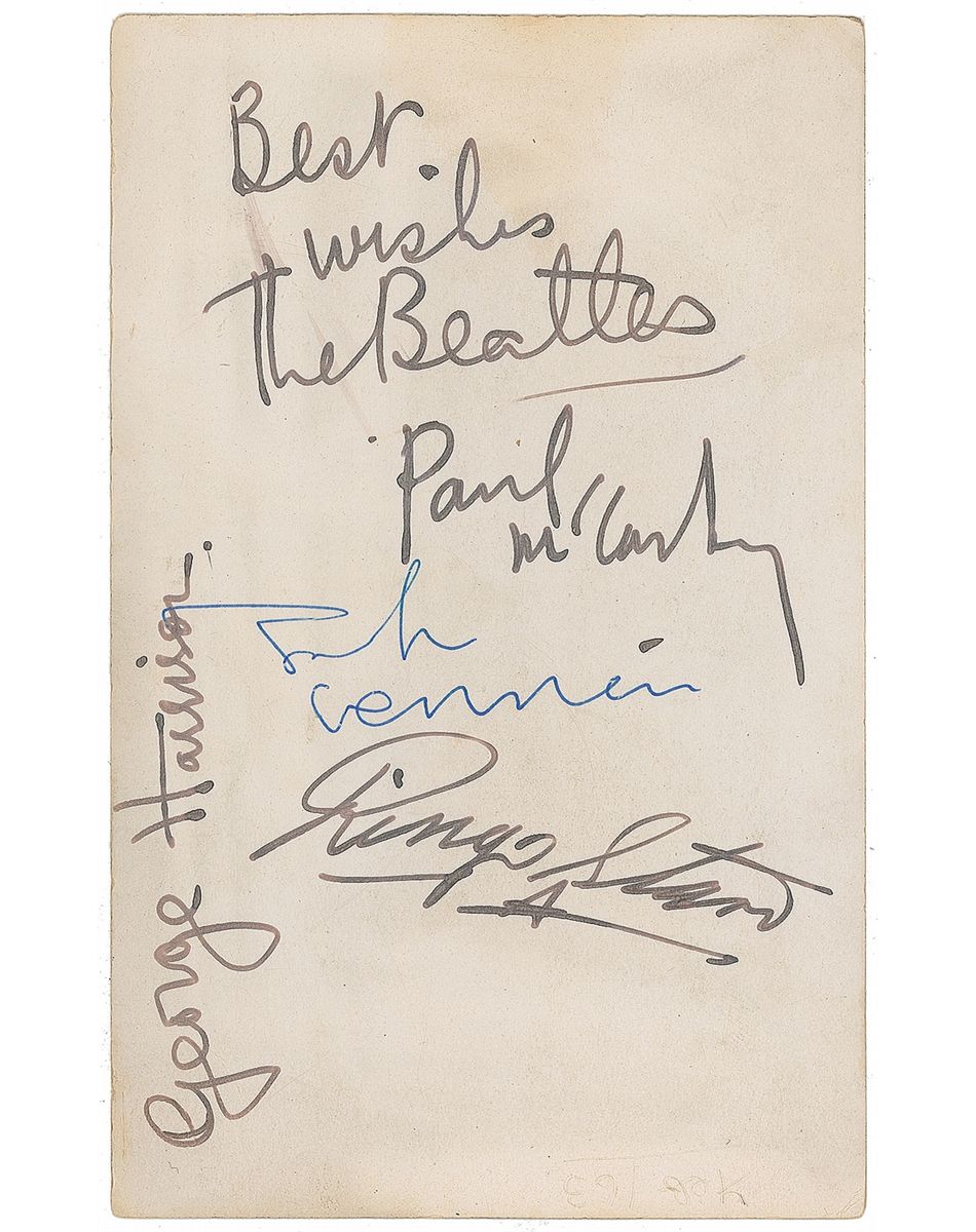 Vintage 5.75 x 3.5 Parlophone promo card featuring an image of the band in matching dark suits, signed on the reverse in blue ballpoint, “John Lennon,” and in black fountain pen, “Best wishes The Beatles, Paul McCartney,” “Ringo Starr,” and “George Harrison,” who has signed vertically. In fine condition, with some scattered mild toning to both sides and a trivial brush to McCartney’s sentiment. A great example boasting particularly bold signatures on one of their early promotional cards. Accompanied by a certificate of authenticity from Tracks.