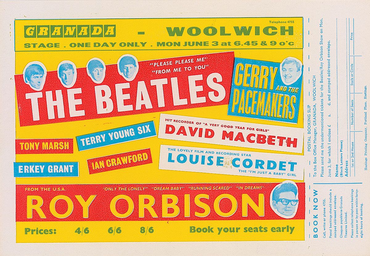Original color 10 x 7 handbill for the Beatles June 3, 1963, concert at the Granada in Woolwich, along with Roy Orbison and Gerry and the Pacemakers. The ticket order form is still present along the right side. In fine, bright condition. Accompanied by a certificate of authenticity from Tracks.