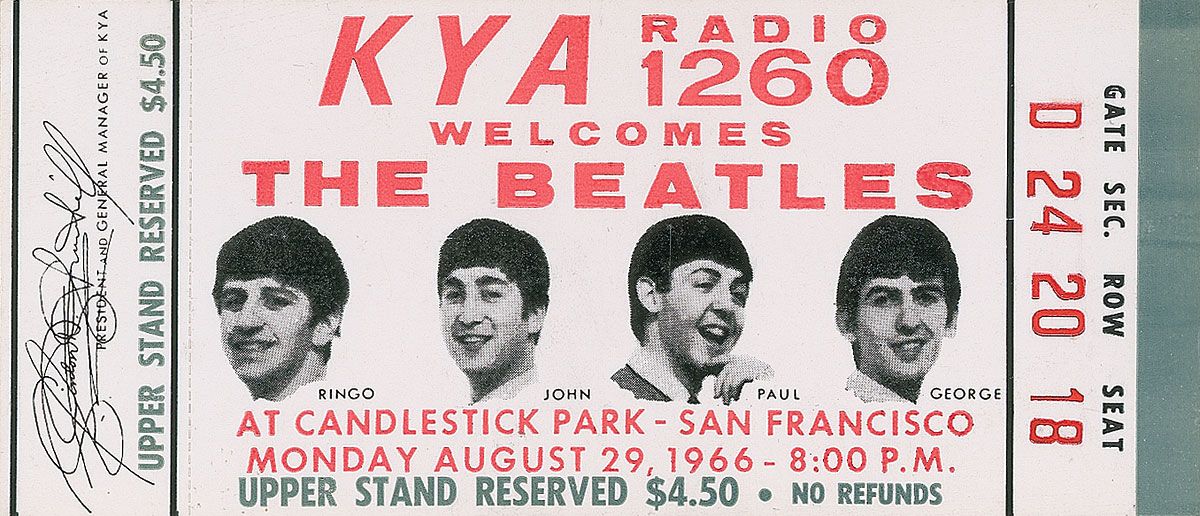 Spectacular original unused ticket from the Beatles last ever concert at Candlestick Park, San Francisco, held on August 29, 1966. Ticket measures 5.75 x 2.5 with red type and head shots of each Beatle. In fine, clean condition. This was the Beatles' last concert tour appearance ever, a 33-minute performance in front of 25,000 fans.
