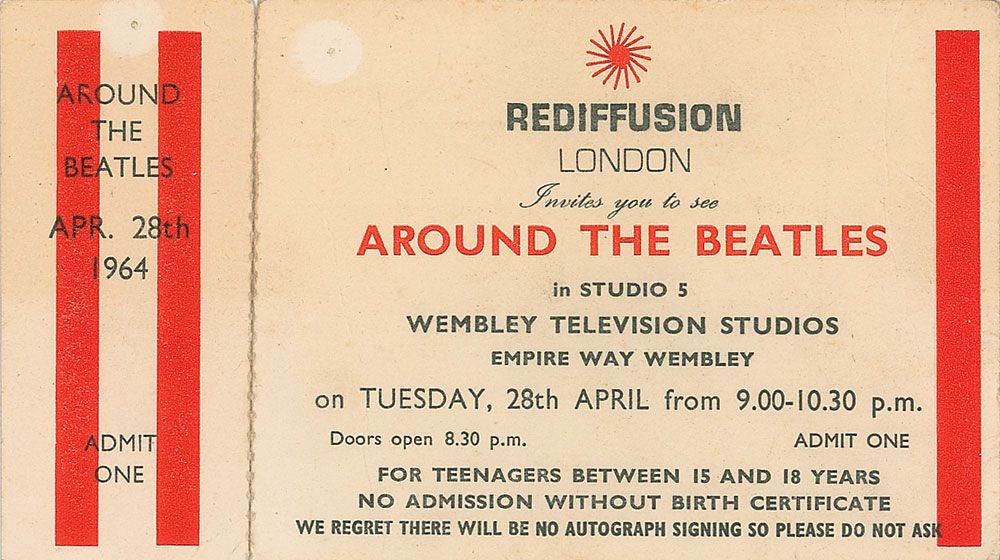 Original ticket from the filming of the Beatles TV special Around The Beatles, 4.25 x 3.25, which took place on April 28, 1964, in Studio 5 of the Wembley Television Studios. At the bottom, ticket states, “For Teenagers between 15 and 18 years. No admission without birth certificate. We regret there will be no autograph signing so please do not ask.” In very good condition, with stub having been professionally reattached, uniform toning, mild creases, and two tack holes to top. Accompanied by a certificate of authenticity from Tracks.