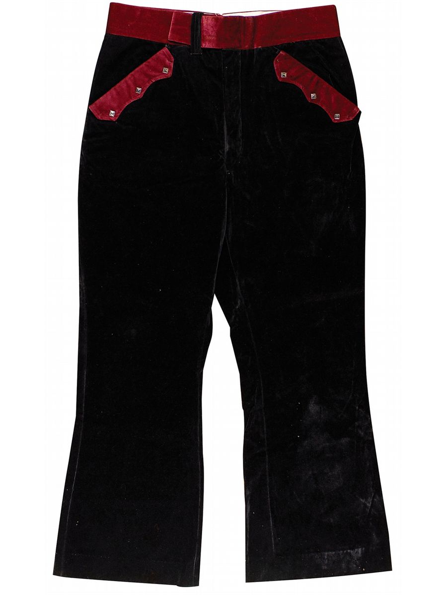 Vintage 1966 mod boutique slacks. Black velvet pants with burgundy trim and highlighted pockets with label inside of waistband reading “The Beatles by Ninth Street East, Ltd. Los Angeles 1966.” In fine condition.