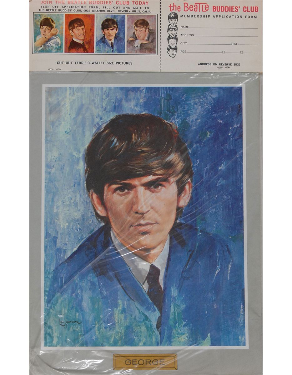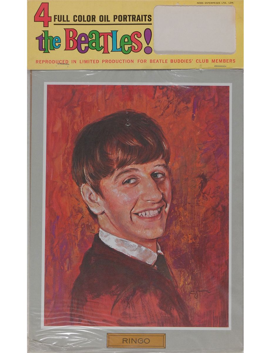 Unopened set of four color 9 x 12 portraits produced in “limited production for Beatle Buddies’ club members,” issued by Nems Enterprises, Ltd., London. Overall size of packaging is 9.5 x 15.5. Top of package originally would have included a club membership card, which has since been removed. In fine condition, with a few light creases to packaging at the top and slight dings to lower right corner tips of the portraits.