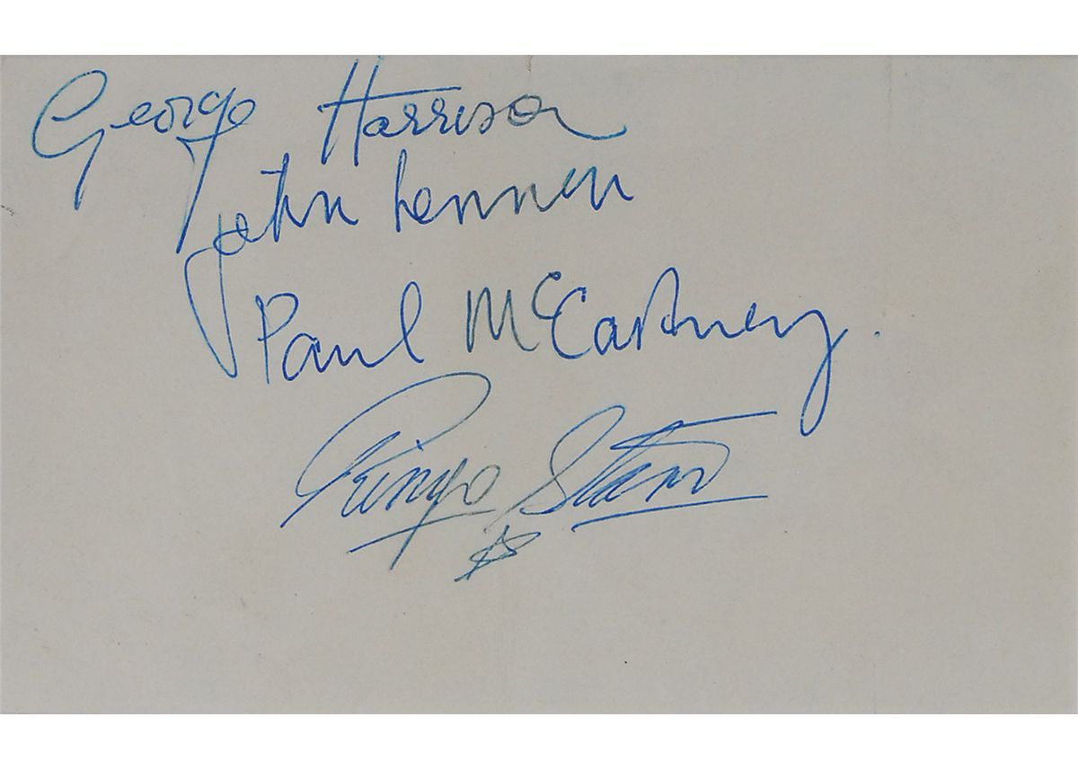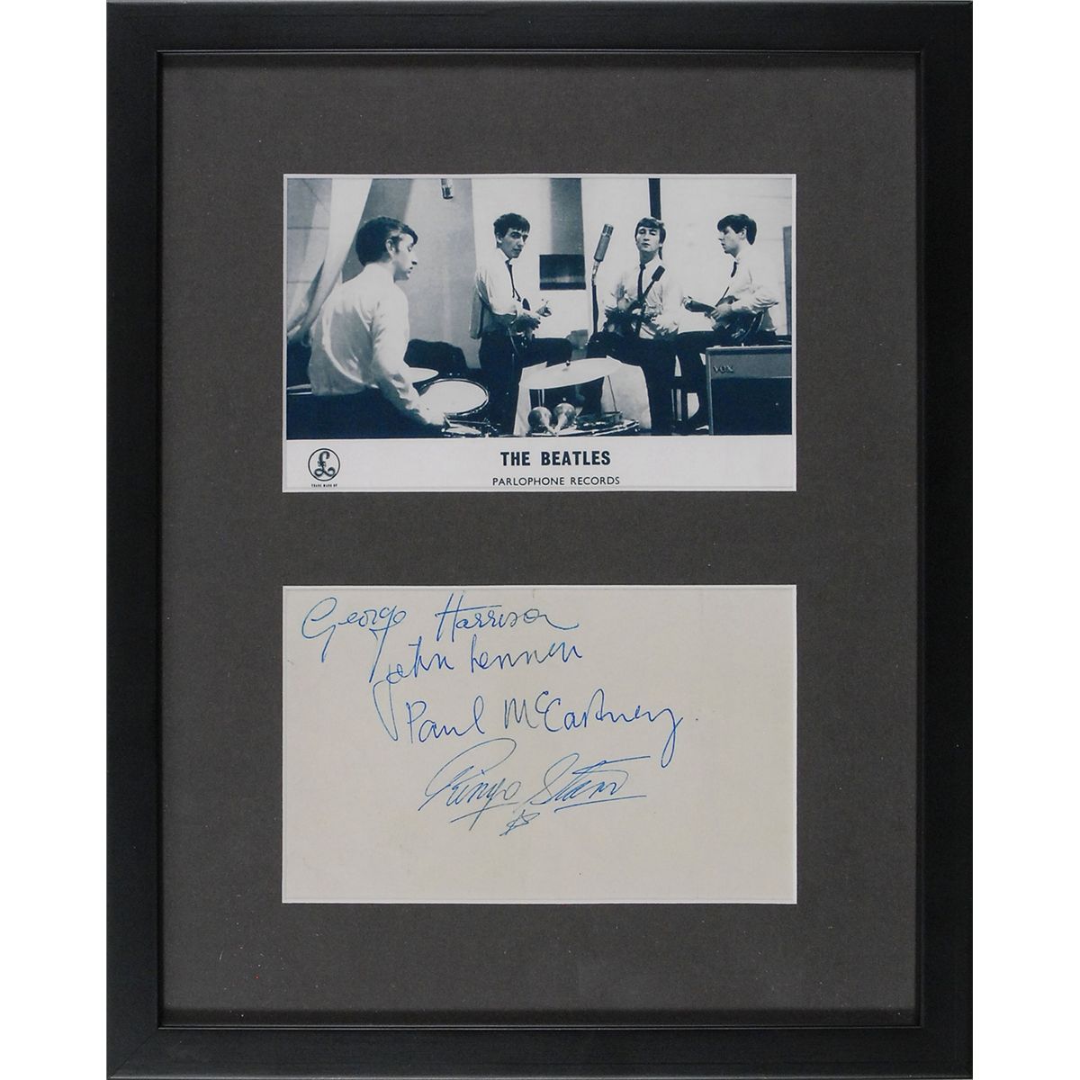 Vintage Parlophone Records promotional photocard from October of 1962, featuring an image of the band working in the recording studio originally taken by Dezo Hoffmann, 5.25 x 3.25, signed on the reverse in blue ballpoint, circa late 1962, by George Harrison, John Lennon, Paul McCartney, and Ringo Starr.” Matted and framed with a laserprint of the front of a similar card to an overall size of 9 x 11.25. Reverse of the card has been professionally cleaned, including around the signatures. Aforementioned cleaning and a couple of light creases, one touching top of Harrison’s last name, otherwise fine condition. Taken at Abbey Road Studios during their recording session of ‘Love Me Do’ on September 4, 1962, by famed Beatles photographer Dezo Hoffmann, this image shows the group in their final incarnation at the very beginning of their storied career, and is the first promo card with new drummer Ringo.