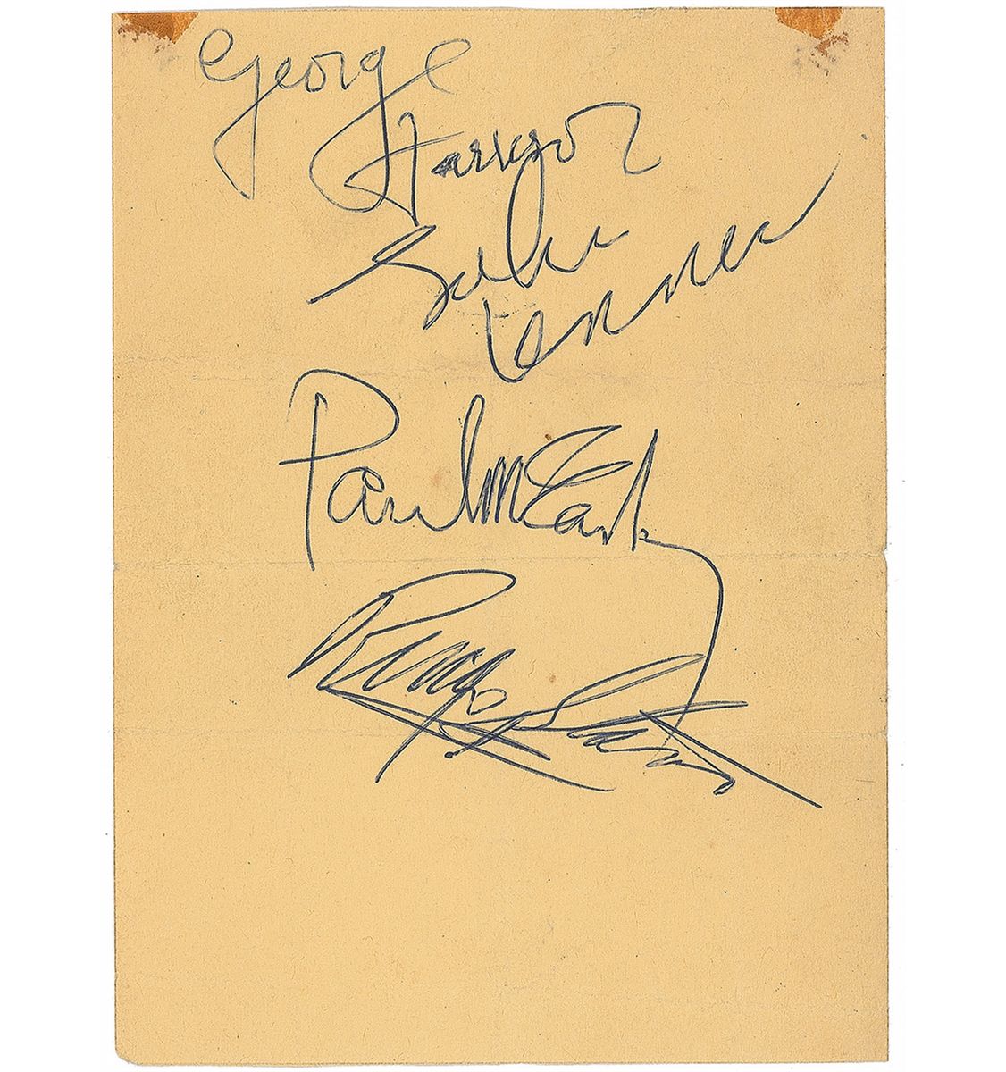 Vintage circa mid-1963 to early 1964 ballpoint signatures, “George Harrison,” “John Lennon,” “Paul McCartney,” and “Ringo Starr,” on a cream-colored 3.75 x 5.25 album page. In very good condition, with unobtrusive intersecting folds passing through signatures, and toned tape remnants to upper corners. Accompanied by a certificate of authenticity from Tracks.