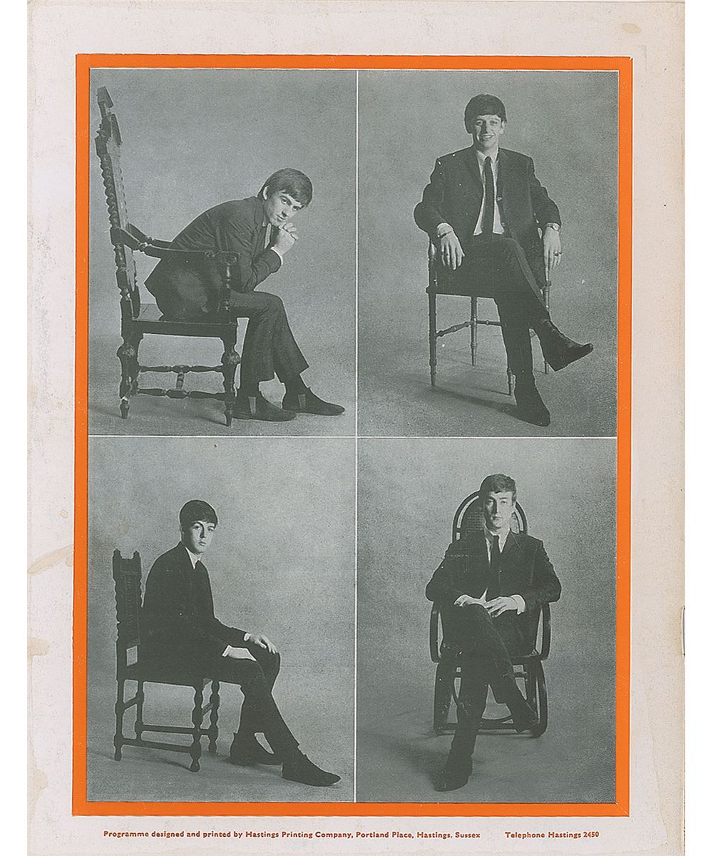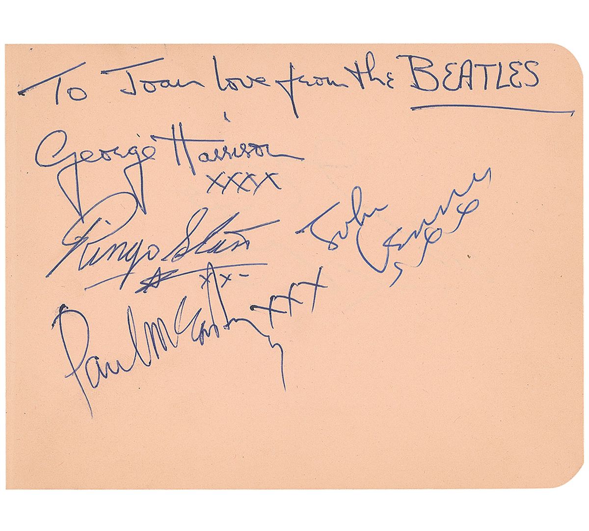 Fantastic ballpoint signatures and inscription, “To Joan, love from the Beatles, George Harrison xxxx,” “Ringo Starr xx,” “John Lennon xxx,” and “Paul McCartney xxx,” on a beige 6.5 x 5 album page. Page is still housed in its original hardbound 6.5 x 5.5 autograph album. Tommy Roe has signed on the reverse of the page, Chris Montez on the preceding page, and The Terry Young Six on two other pages. In fine, clean condition. Signatures were acquired during the band’s March 24, 1963 show at the Empire Theatre in their hometown of Liverpool, as a supporting act for Chris Montez and Tommy Roe. Accompanied by a letter of provenance from the original owner, whose father obtained the signatures for her after the show. Also included is a program from the show.