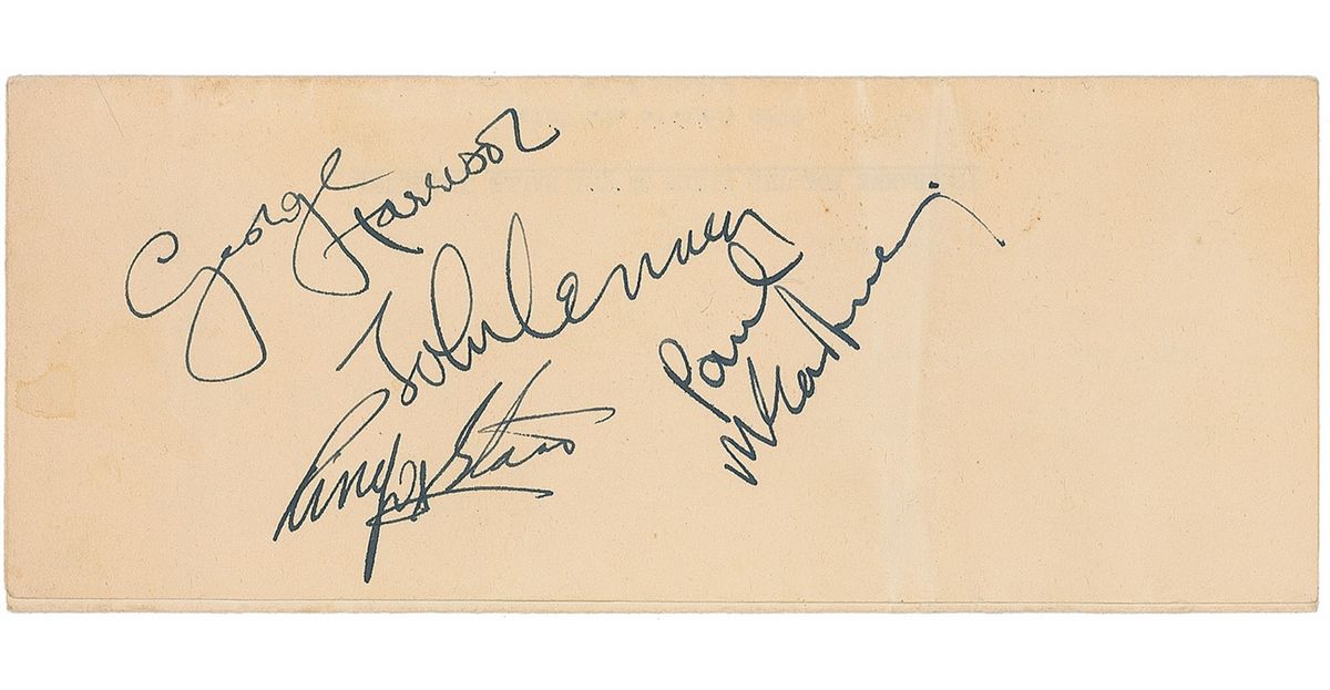 Itinerary for Halle Orchestra’s series of concerts which took place in Buenos Aires, Argentina, between June 27 and July 3, 1966, one page, 8 x 13, boldly signed on the reverse in black ink by John Lennon, Paul McCartney, George Harrison, and Ringo Starr. Folded to an overall size of 8 x 3.25 so that only the panel with the autographs shows. A noticeable vertical crease passing through the last letter of McCartney’s signature and a couple trivial stains, otherwise fine condition. Accompanied by a certificate of authenticity from Tracks. The autographs were originally obtained by Halle Orchestra horn player Julian Baker. A choice grouping of bold, beautiful signatures seldom-seen in 1966 examples, as the band was withdrawing from the public spotlight.