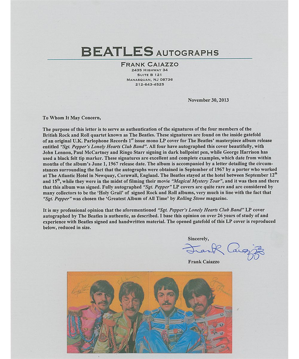 Incredibly rare U.K. Parlophone Records first issue mono Sgt. Pepper’s Lonely Hearts Club Band album, beautifully signed on the full-color gatefold in dark ballpoint by Paul McCartney, John Lennon, and Ringo Starr, and in black felt tip by George Harrison. In fine condition, with some mirroring of Harrison’s signature to opposite side of gatefold (touching the top of a couple letters of Starr’s signature), and some scattered light edge creases, not detracting from the overall impressive appearance of the album. The record is included in its red and white psychedelic inner sleeve on the right side of the double-sided sleeve, and the original full sheet of card cut-outs remains in the left. Accompanied by a handwritten letter of provenance, dated 1985, from the original recipient of the signatures, an employee at the Atlantic Hotel, where the band stayed from September 12-15. His letter, written to a member of Sotheby’s auction house, reads, in part: “I got the LP signed when I met them in my home town nearly 20 years ago. I’d just left school and my friend’s mum got me a steady summer job as a porter at the Atlantic Hotel in Newquay. To my and everybody’s amazement, the Beatles stayed at the Atlantic for a few days while they were filming…The Sgt. Peppers L.P. had only just been released a few months prior. The manager told all the staff who worked at the hotel not to bother or ask them for their autographs…I thought it was a good idea to take something back and have it signed. I sneaked the album back into work up my top as I didn’t want the manager to see. The Beatles didn’t seem to mind anyway as they signed a few items for staff and guests. I remember having to get George’s at a later day, as he wasn’t present when Paul, Ringo, and John signed.” Also accompanied by a letter of authenticity from noted Beatles expert Frank Caiazzo, who states, “These signatures are excellent and complete examples, which date from within months of the album’s June 1, 1967, release date…Fully autographed ‘Sgt. Pepper’ LP covers are quite rare and considered by many collector’s to be the ‘Holy Grail’ of signed Rock and Roll albums.” At the time of signing, the band had become a bit more accessible to their fans—particularly during the filming of Magical Mystery Tour, during which they would occasionally stop and interact with fans, signing whatever was available on the spot, which was usually menus, autograph albums, or postcards. Fortunately, this clever young man had the luck and opportunity to have his album signed. Upon its release on June 1, 1967, Sgt. Pepper skyrocketed to the top of the charts, dominating the number one slots of both the UK Album Chart (for the next 23 weeks) and of the US Billboard 200 (for the next fifteen); to this day, it routinely tops industry and fan polls, and has earned the distinction of ‘The Greatest Album of All Time’ by Rolling Stone. Only a handful of authentic complete band-signed Sgt. Pepper albums are known to exist, and are very seldom offered for sale at public auction. This album—crisply signed by each member around his image on the vibrant gatefold—is arguably one of the most desirable pieces in the world of rock ’n’ roll collecting.