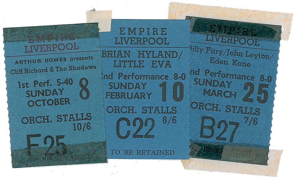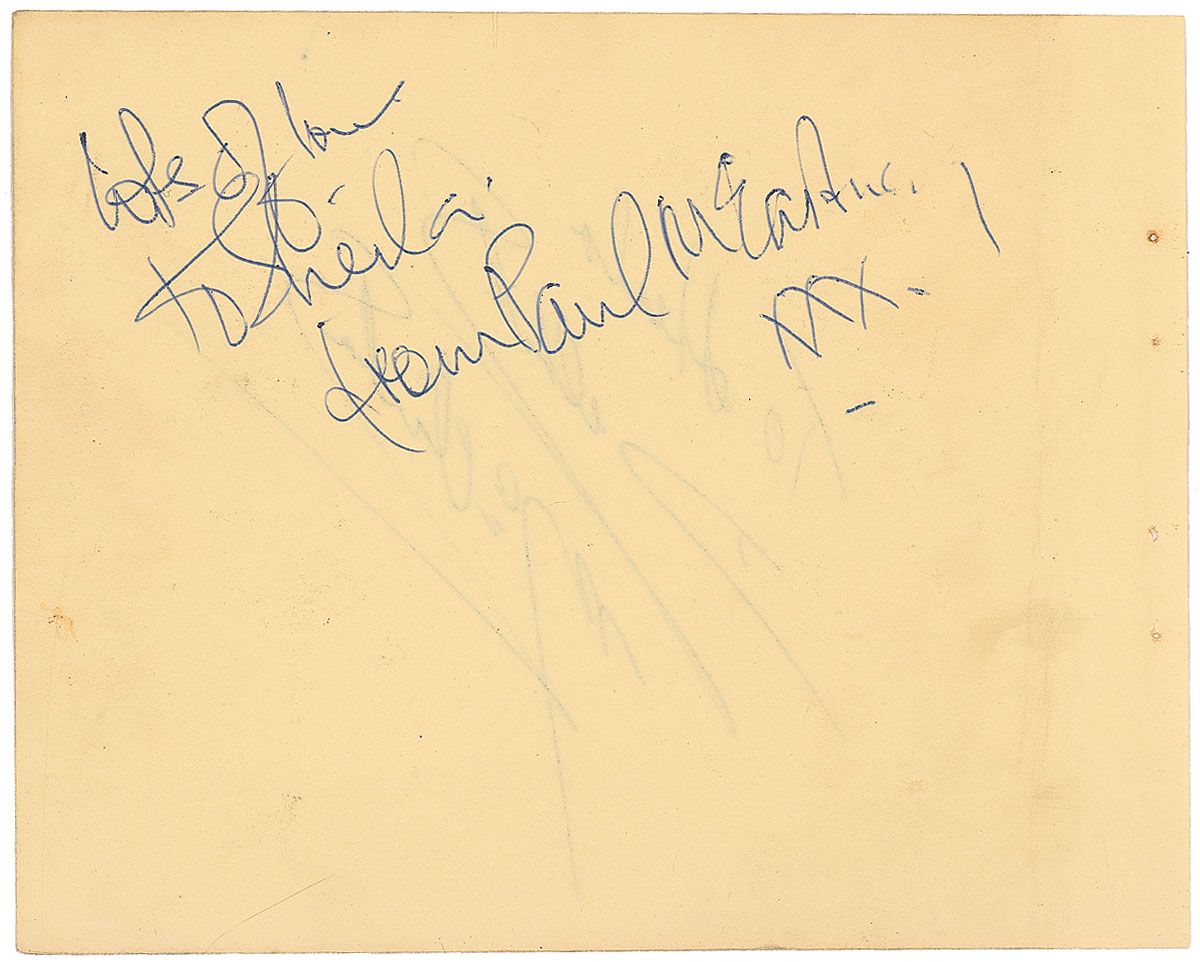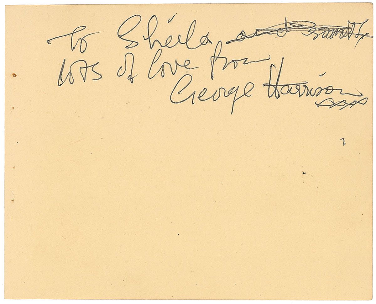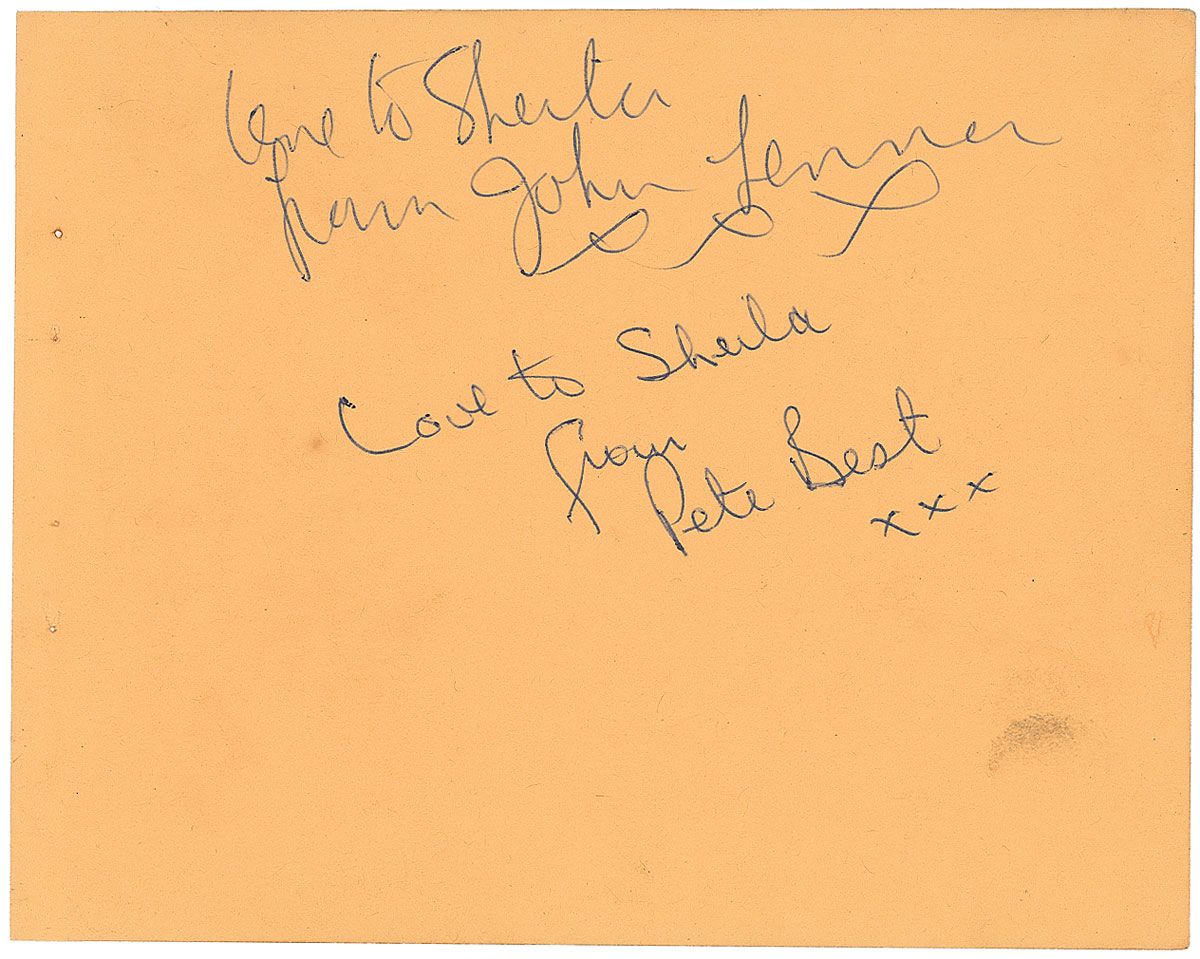 Vintage ballpoint signatures and inscriptions, “Love to Sheila from John Lennon xxx,” “Love to Sheila from Pete Best xxx,” “To Sheila lots of love from George Harrison xxx,” and “Lots of love to Sheila from Paul McCartney xxx,” on three beige 5.5 x 4.5 album pages. Accompanied by the rest of the original hardcover autograph album (with George Harrison’s license plate number written on the inside back cover), as well as three ticket stubs to the Empire Liverpool, but none from a Beatles appearance. In fine condition, with some slight show-through from a signature on the reverse of McCartney’s page. A particularly well-preserved and early example as Best would be replaced in August of 1962 by drummer Ringo Starr.