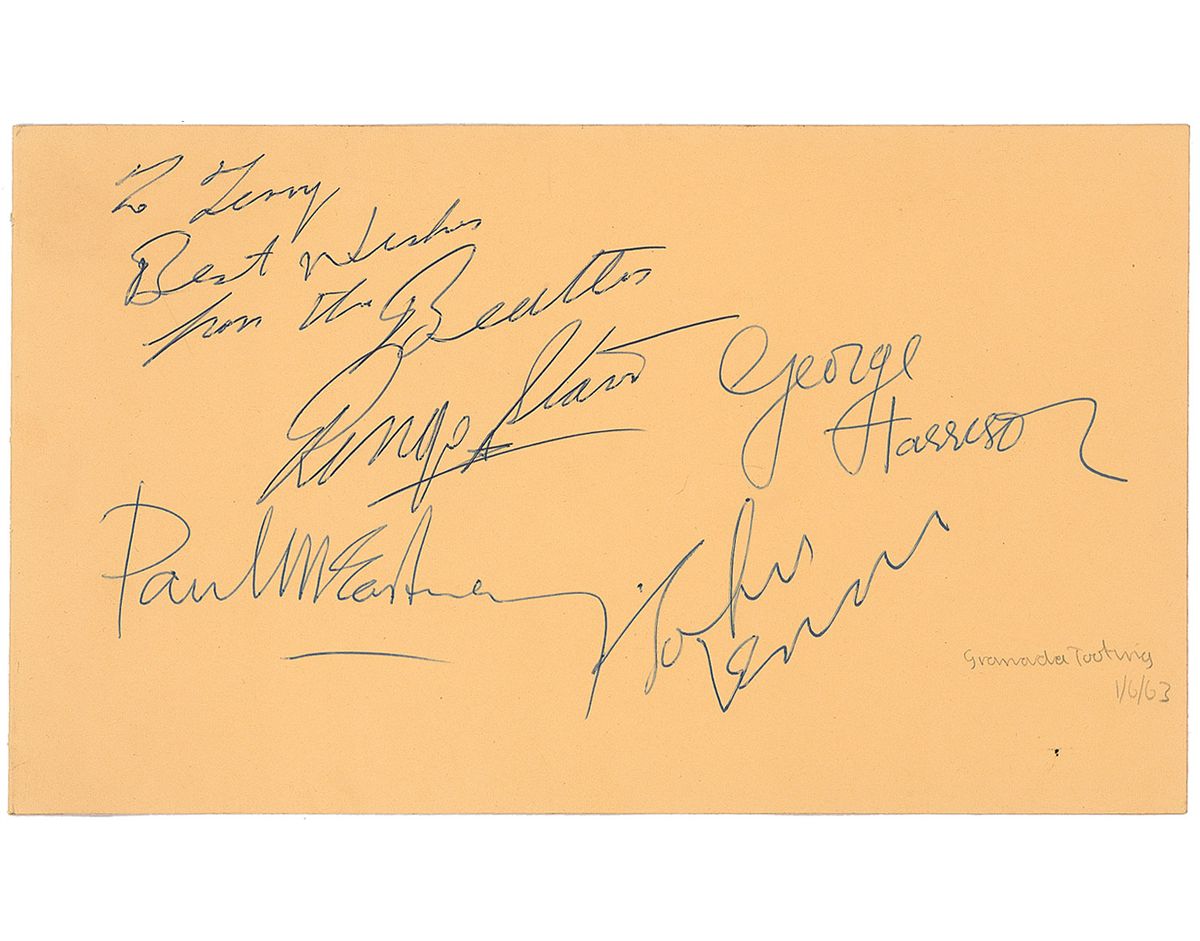 Magnificent vintage ballpoint signatures, “Paul McCartney,” “John Lennon,” “George Harrison,” and “To Terry, Best wishes from the Beatles, Ringo Starr,” on a beige 8.5 x 5 album page, with a small pencil notation to lower right in a collector’s hand reading, “Granada Tooting 1/6/63.” In very fine condition. Accompanied by a full letter of authenticity from Roger Epperson/REAL. Signatures were originally obtained by a fireman on duty at the Granada Old Cinema and Theatre in Tooting, their only appearance at the ornate cinema, and the 14th stop on their UK tour with Roy Orbison. As nice a set of signatures as you are likely to find, exceptionally large and crisp for this format.
