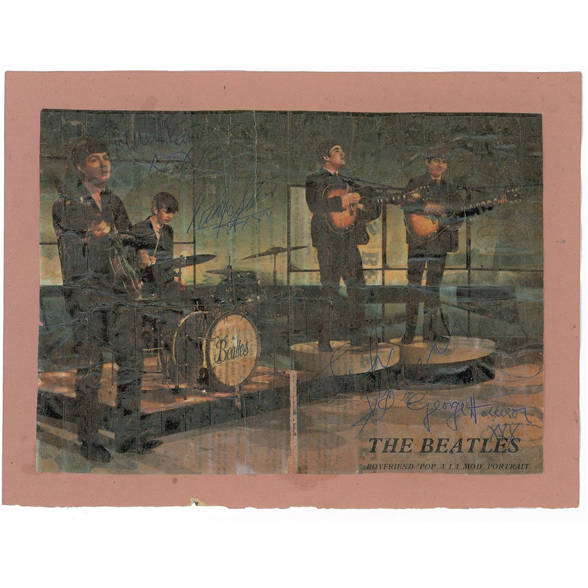 Color vintage 10 x 7.25 magazine photo of the band performing, taken from Boyfriend magazine, signed in blue ballpoint, “Love, Paul McCartney xxxx,” “Ringo Starr xxx,” “John Lennon,” and “George Harrison xxx.” Photo is affixed to an 11.5 x 9 sheet. Uniform light creasing and wrinkling, small area of paper loss to central lower portion, and light to moderate contrast to three of the signatures, otherwise very good condition. This photo was part of a longer article from an early 1963 issue of Boyfriend magazine, which offered one of the first in-depth looks at the band.