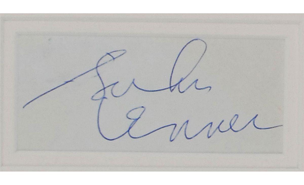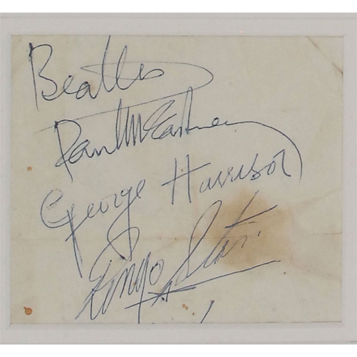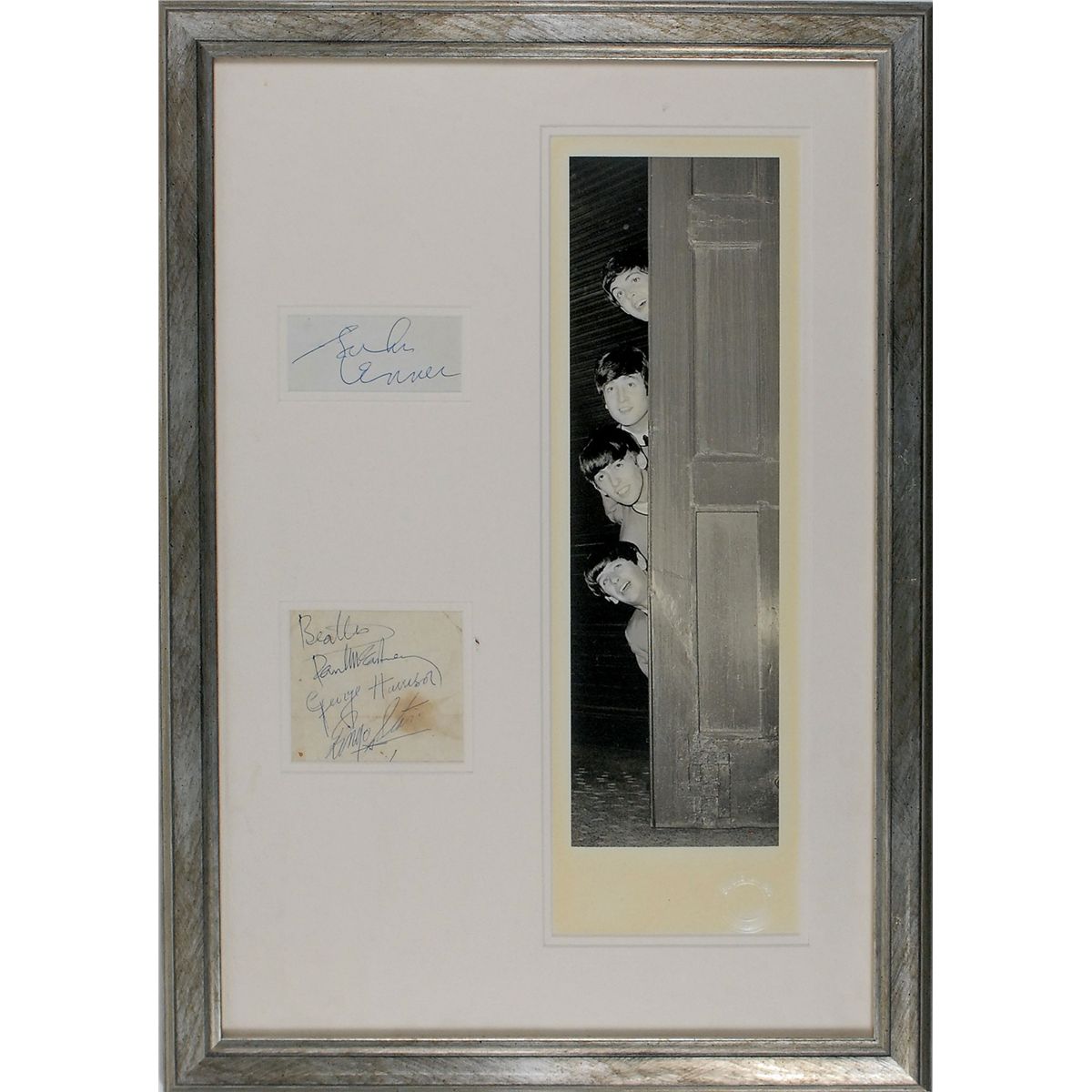 Vintage ballpoint signatures, “Beatles, Paul McCartney,” “George Harrison,” and “Ringo Starr,” on an off-white sheet; and a ballpoint signature, “John Lennon,” on an off-white slip. Both are double-matted and framed with a photo of the band looking out from behind a door to an overall size of 17 x 24. In very good condition, with folds and creases to multi-signed sheet, as well as a spot of toning over Starr’s signature, and some scattered surface loss around Lennon’s signature.