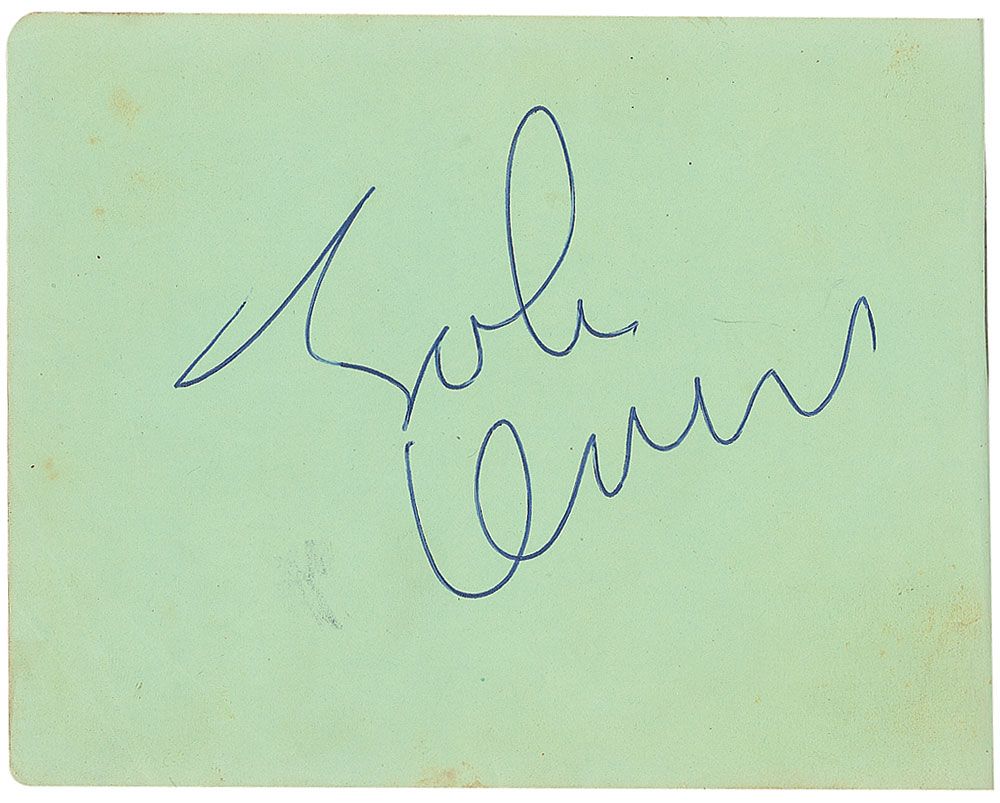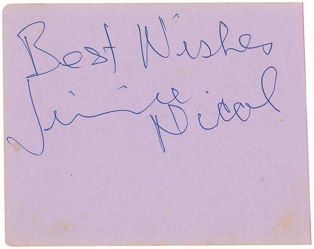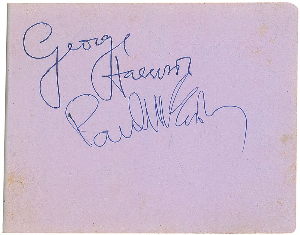 Vintage ballpoint signatures “John Lennon,” on a light green 4.75 x 4 album page, and vintage ballpoint signatures, “George Harrison,” and “Paul McCartney,” on one side of a same-size light purple album page, with a ballpoint signature, “Best wishes, Jimmy Nicol,” on the reverse. Both pages are still housed in their original 5.25 x 4 hardcover autograph album, which is also signed by the 1964 Everton Football Club. In fine condition, with a bit of scattered light toning and moderate surface impressions to signed pages from the signatures on the opposite side. A unique combination, as Nicol’s tenure with the band was brief, and it was the first time the English premiers played in Australia. Nicol replaced Ringo Starr from June 3–15, 1964, at the start of the Beatles’ World Tour, while Ringo was suffering from tonsillitis and pharyngitis. An extremely rare offering, as Nicol was with the Beatles for slightly more than a week.
