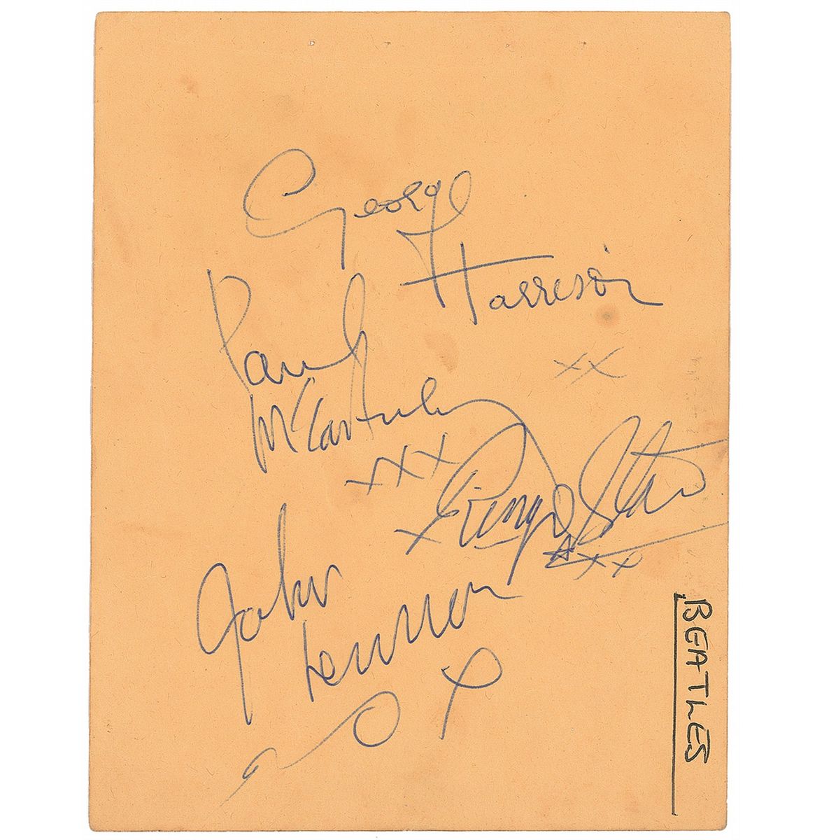Vintage circa early 1963 ballpoint signatures of John Lennon, Paul McCartney, George Harrison, and Ringo Starr on an off-white 4.5 x 5.75 album page bearing a collector’s notation. Overall creases and wrinkling, otherwise fine condition. Accompanied by a certificate of authenticity from Tracks. Their debut album, Please Please Me, was released on March 22, 1963, following the tremendous success of their hit singles ‘Please Please Me’ and ‘Love Me Do.’