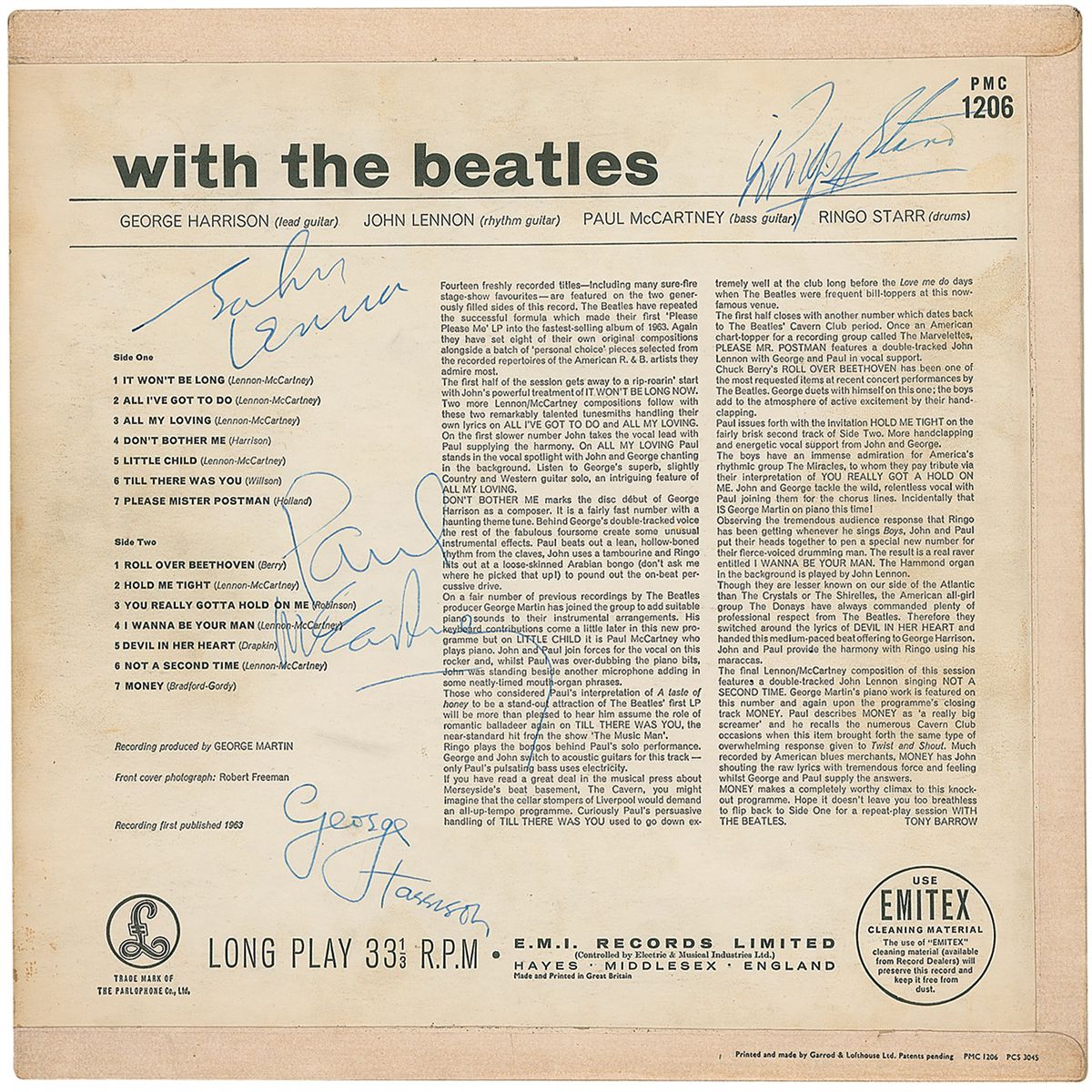 Very rare With the Beatles album beautifully signed on the back cover in blue fountain pen by John Lennon, Paul McCartney, George Harrison, and Ringo Starr. In fine condition, with some scattered light toning to back cover, and a mild album impression to front cover. The record is included. Accompanied by a letter of provenance from the original owner of the album. Letter reads, in part: “The signed With the Beatles album was obtained for me back stage by a school friend on 13the December 1963 in Southhampton. Her father was an accountant at the Gaumount Cinema, Southhampton. In having such a great contact with her father she used to get free tickets and had access for all the pop stars autographs of the day.” Their appearance at the Gaumount was the second to the last stop on the band’s Autumn tour, where they played a total of 10 songs, including ‘I Saw Her Standing There,’ ‘She Loves You,’ ‘Roll Over Beethoven,’ and ‘Twist and Shout.’ Research indicates approximately 15 to 20 known band-signed examples of the album, as their skyrocketing popularity made it much more difficult to gain access to the band.
